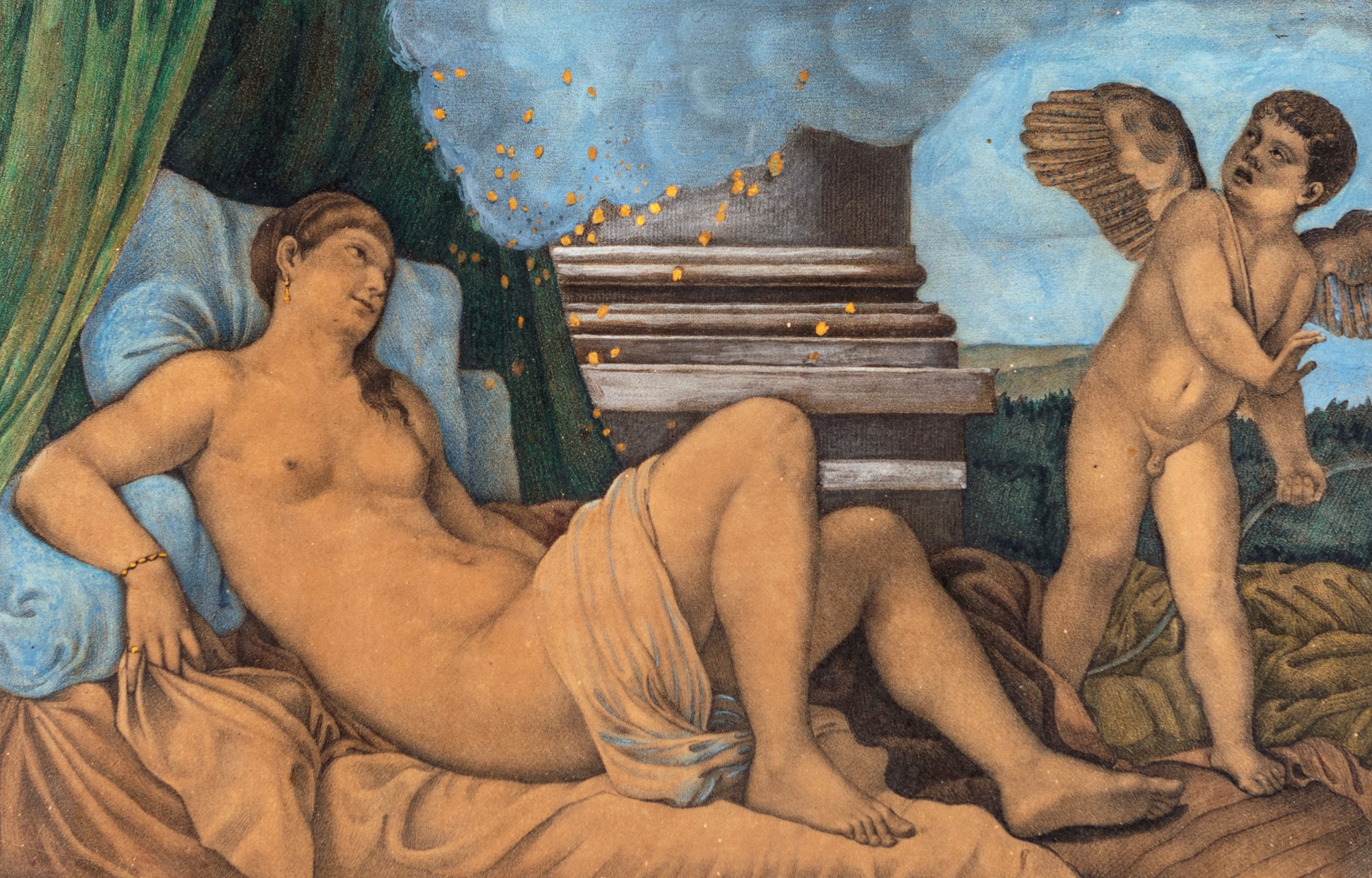 all'interno una stampa colorata raffigurante Venere di schiena e la principessa Danae e Amore. Difetti