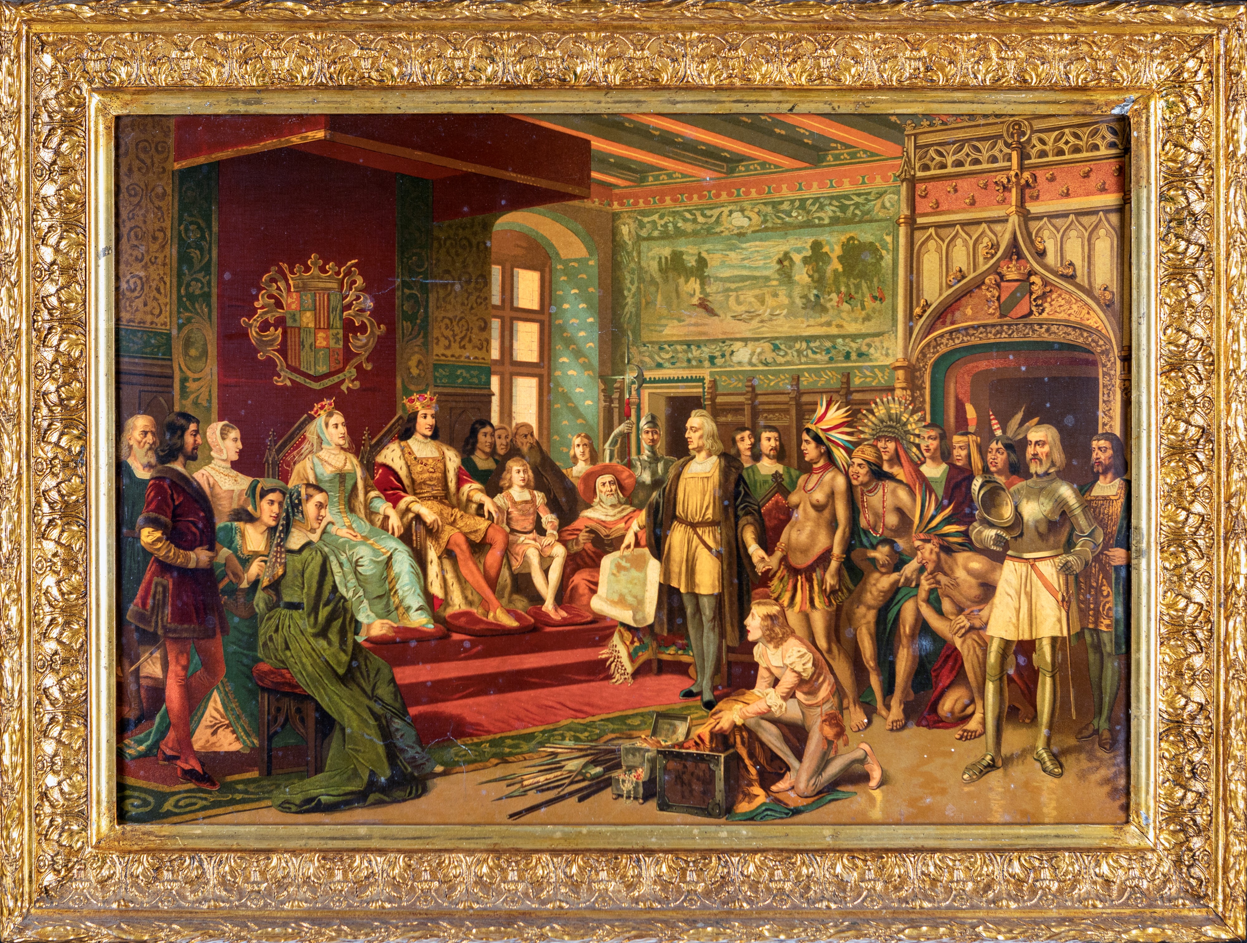 raffiguranti rispettivamente il ritorno di Cristoforo Colombo dall'America e una scena pompeiana da un dipinto di Luigi Crosio