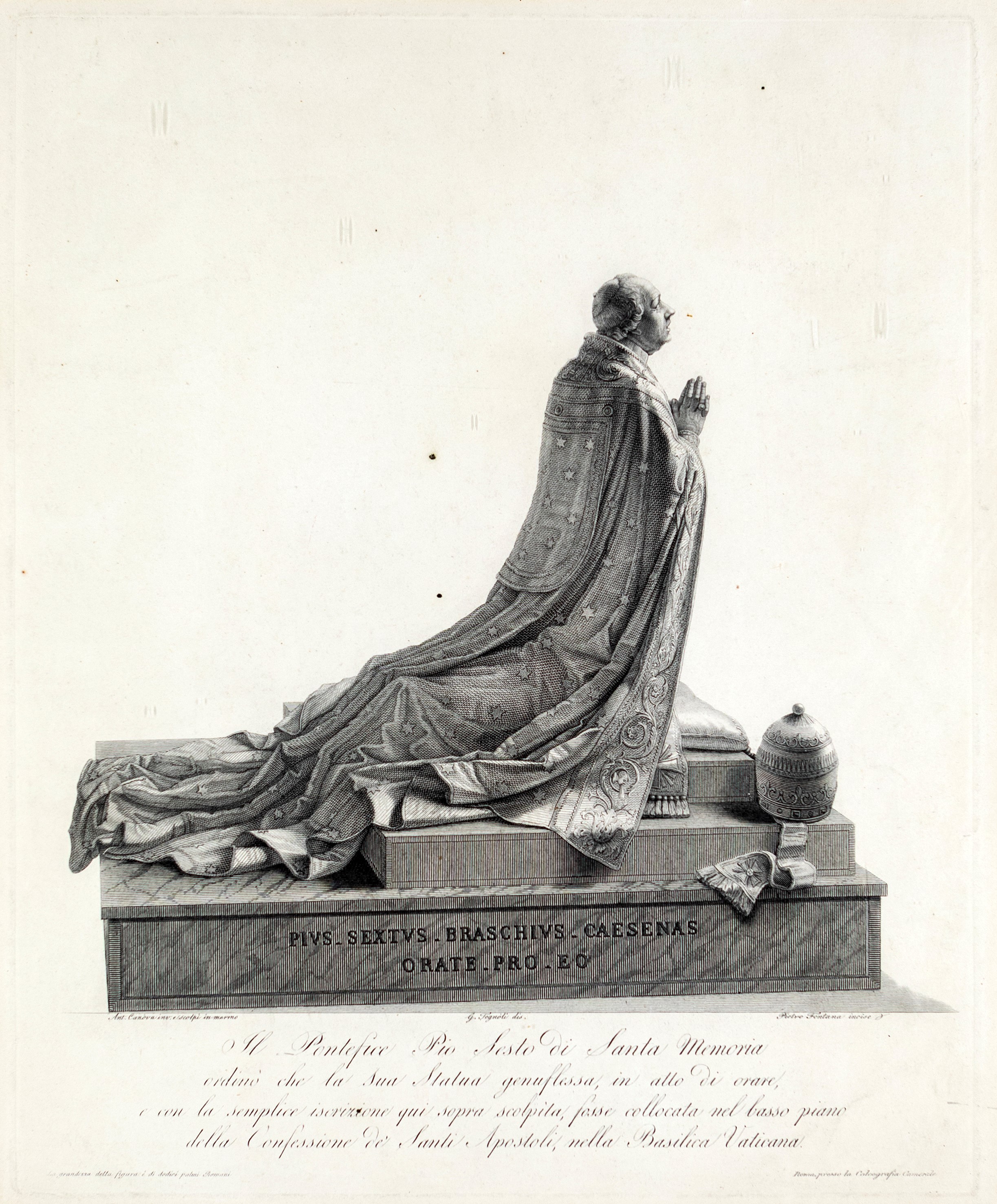 Papa Pio VI in preghiera, scultura di Antonio Canova. Da un disegno di Giovanni Tognoli (1786 - 1862), calcografia nazionale