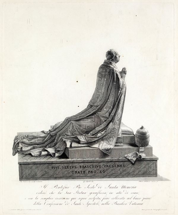 Raffigura il monumento commissionato al Canova dal Duca Braschi, nipote di Pio VI, un tempo davanti la Confessione della Basilica di San Pietro ed oggi nelle Grotte Vaticane. Iniziato nel 1817 e terminato da aiuti essendo il Canova morto nell'ottobre del 1822. Entro cornice moderna in legno color noce.