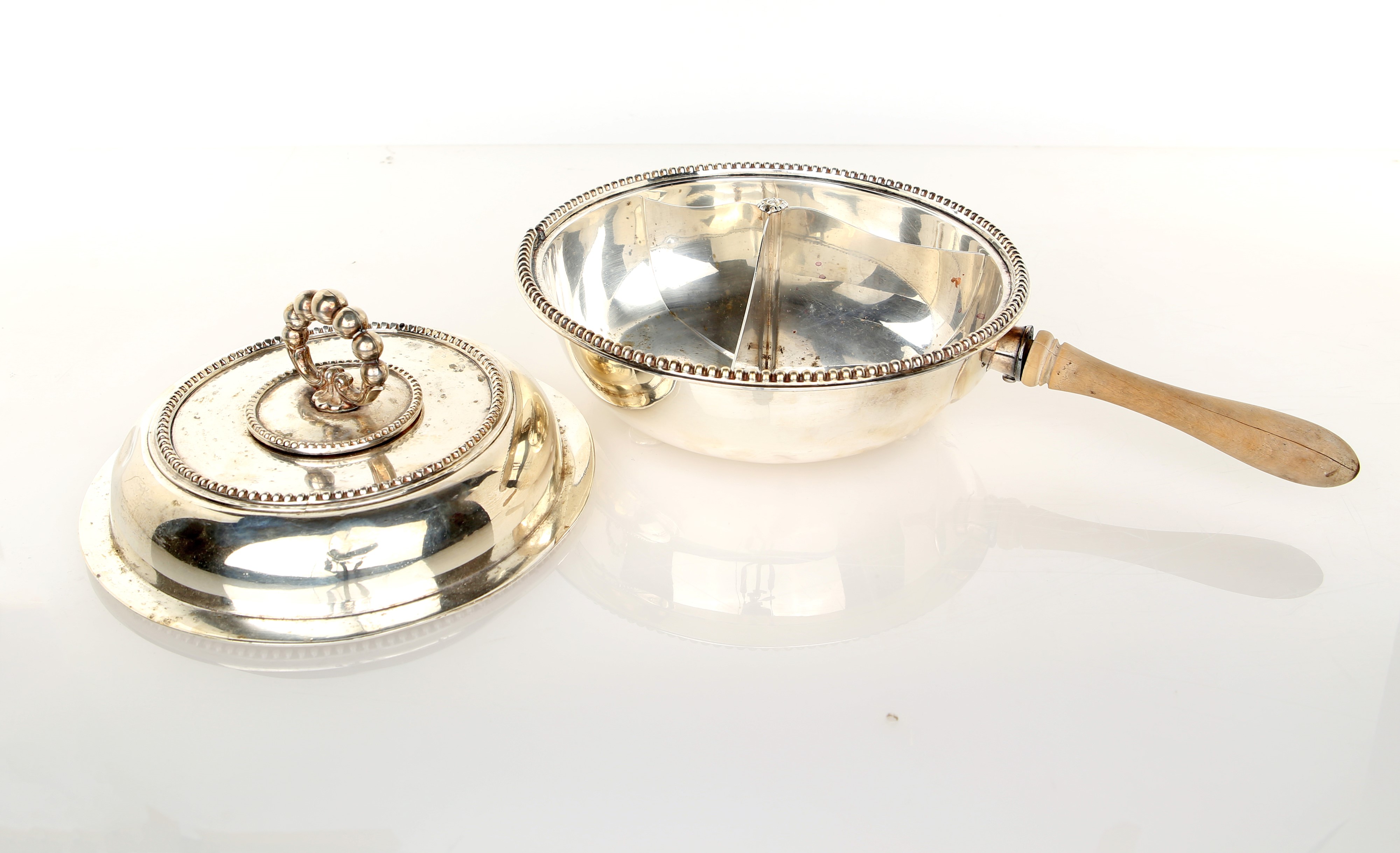 Portavivande in metallo argentato con interno tripartito e manico in legno