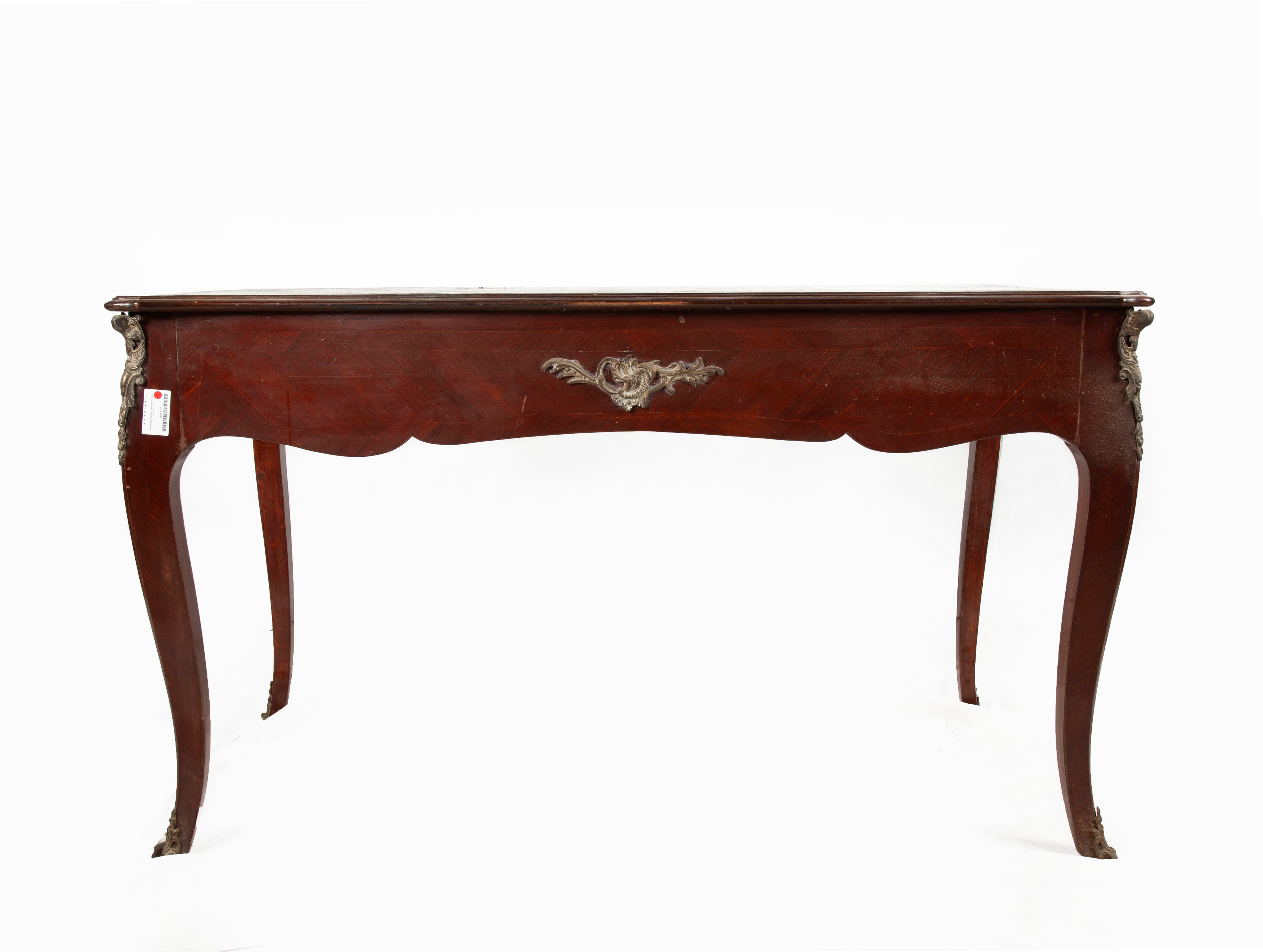 piano rettangolare rivestito in pelle con tablettes laterali estraibili, fascia sagomata suddivisa in tre cassetti, gambe sagomate