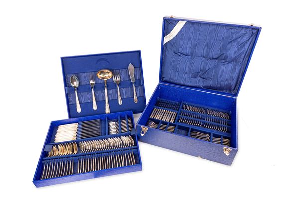 composto da dodici cucchiai da minestra, dodici coltelli e ventiquattro forchette da pasto; dodici coltelli ed altrettante forchette da pesce; dodici coltelli ed altrettante forchette da frutta; dodici cucchiai da dolce e dieci da tè; un ramaiolo e quattro posate da portata. Entro scatola originale a tre piani dei Fratelli Calderoni