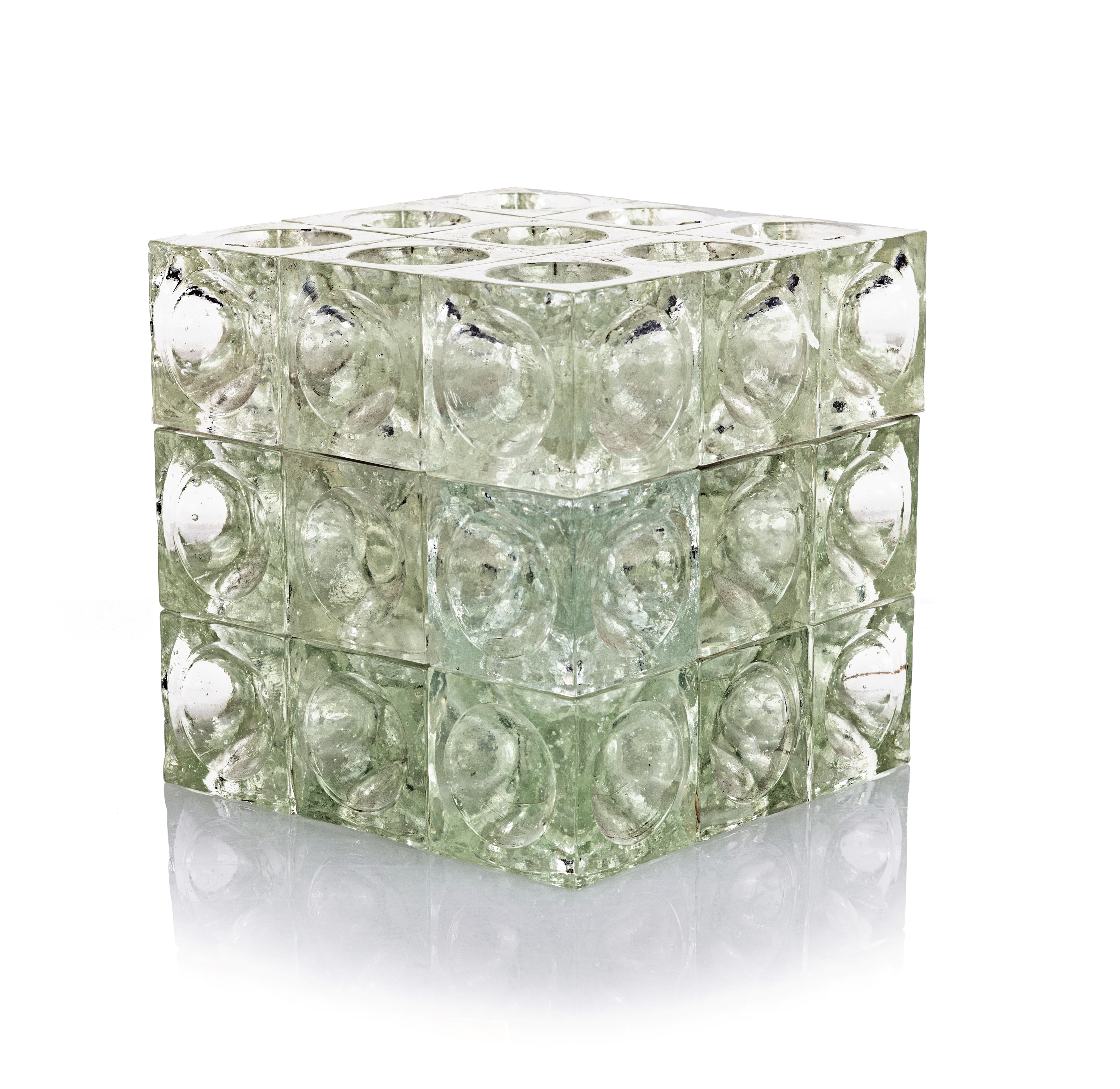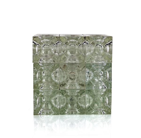 Struttura in metallo cromato ed elementi diffusori cubici a facce convesse. Prod. Poliarte, Italia
