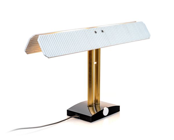 Lampada da tavolo. Struttura in metallo e metallo laccato. Diffusore in ceramica smaltata. Produzione Flos. Reca etichetta sotto la base "Flos Capalonga 1290"