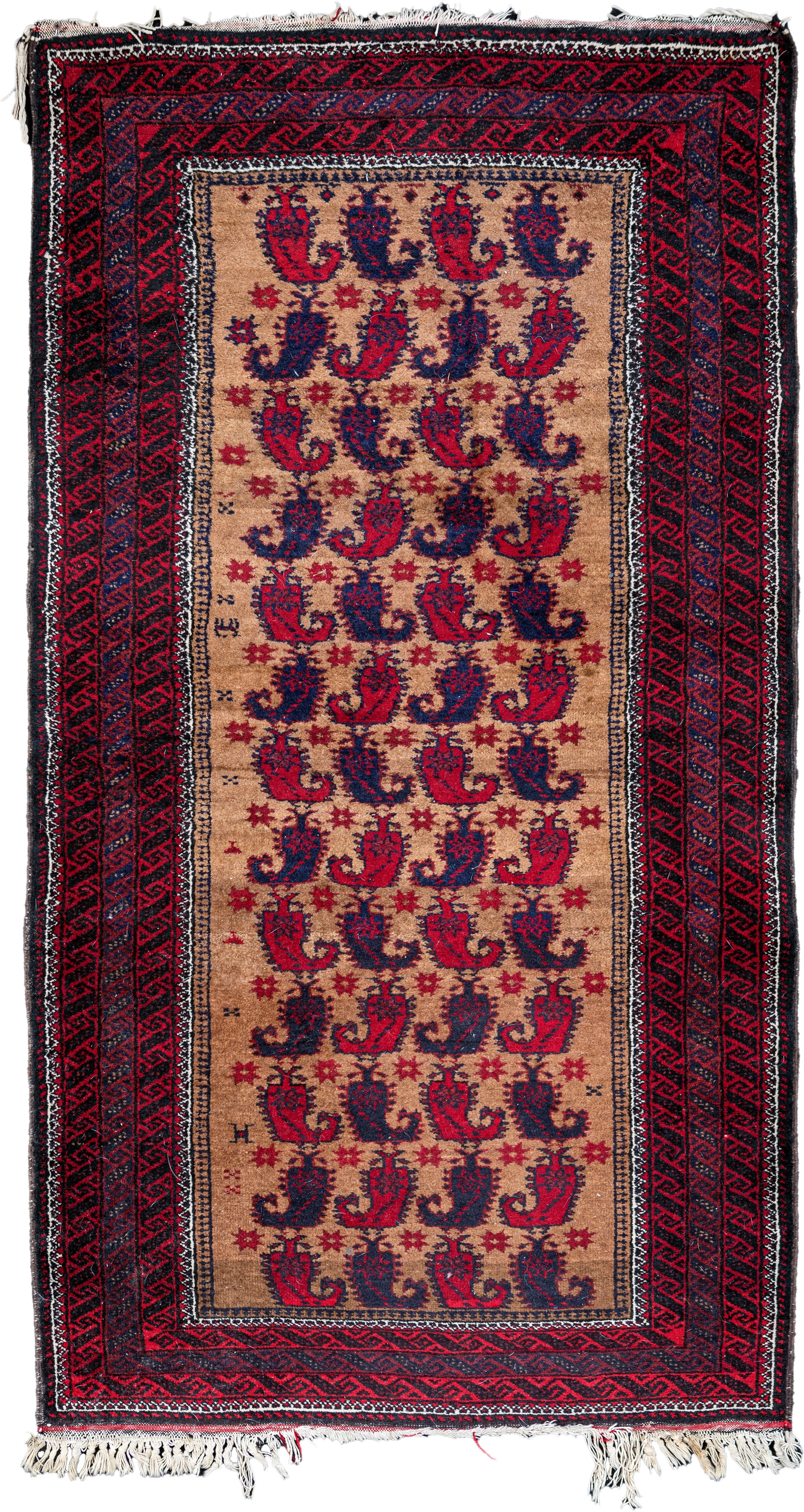 caratterizzato da quattro file parallele con tredici motivi boteh alternati rossi e blu; ampia cornice fondo rosso a disegno geometrici