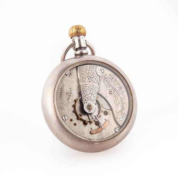 American Waltham Watch Co. - Orologio da tasca da uomo in acciaio. Movimento a vista lavorato a guilloché con scappamento ad ancora, bilanciere con viti, spirale Breguet. Carica remontoir. Quadrante in smalto, con numeri romani e lancette a pera, secondi ad ore 6., 1880 circa