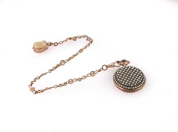 Funzionante. Cassa con punzoni tedeschi e francesi rivestita di perline. Catena lunghezza cm 22.