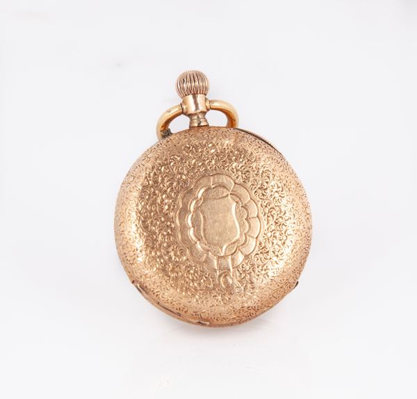Anonimo svizzero - Orologio da tasca in oro 18kt. Movimento con scappamento a cilindro, 8 rubini, carica remontoir. Quadrante in smalto con numeri romani, lancette a fantasia., 1880/90 circa