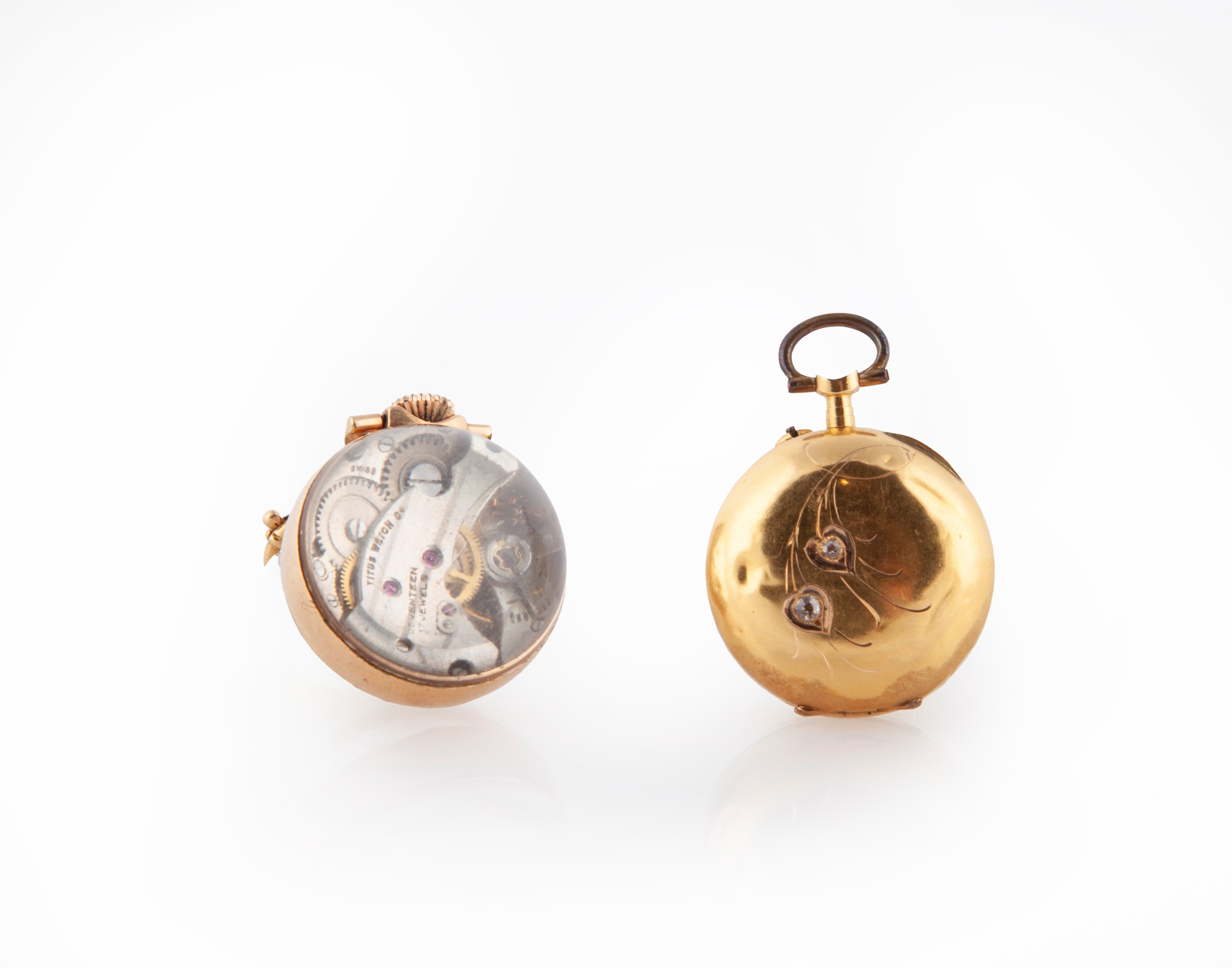 Cora - Orologio da tasca a monachina, meccanismo a cilindro con carica remontoir. Mancante di albero e corona. Cassa e controcassa parapolvere nr. 212097 in oro 18 kt. Cassa decorata con 2 brillantini. 1920 circa. Da revisionare. Diam mm 25