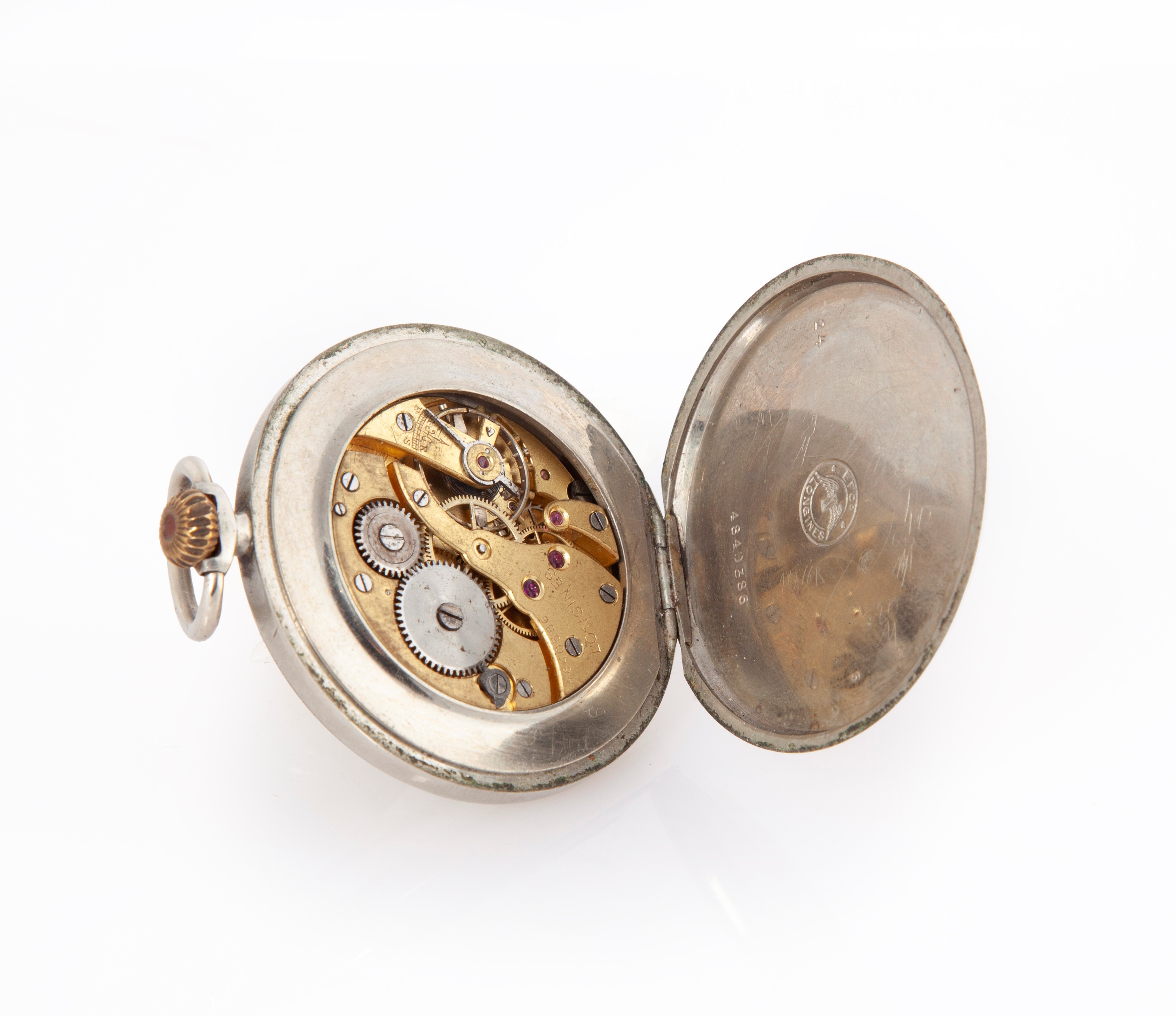Longines realizzato per Buzzetti e f.llo Roma - Orologio da tasca da uomo in metallo con scappamento ad ancora, bilanciere con viti e spirale piana. Quadrante in metallo argentato con numeri arabi dipinti, lancette squelette e secondi ad ore 6, 1940 circa