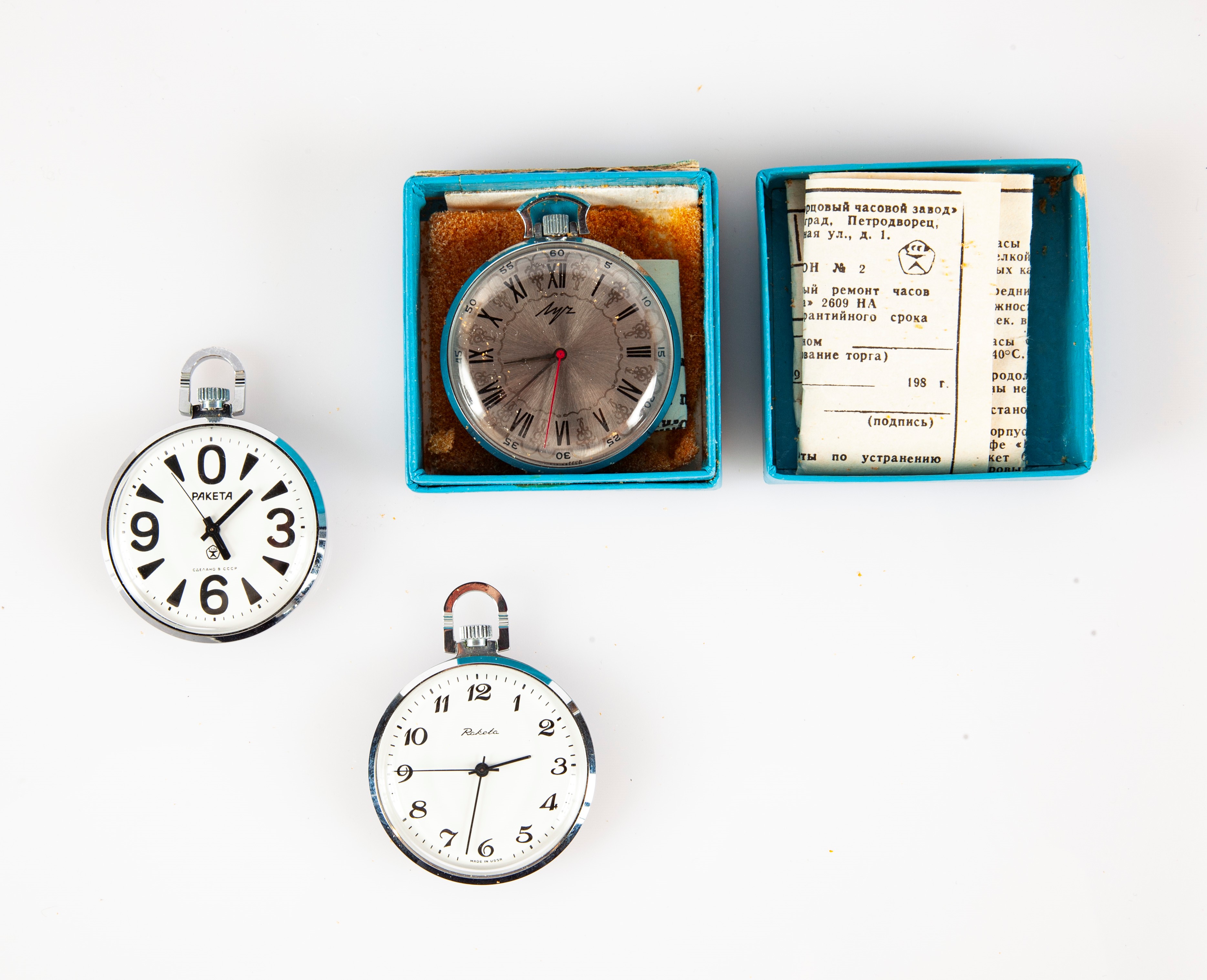 Lotto 3 orologi da tasca: Raketa - 2 orologi da tasca in acciaio a carica remontoir con cassa decorata con una nave / Luch - orologio da tasca in metallo cromato a carica remontoir, 1970/80 circa