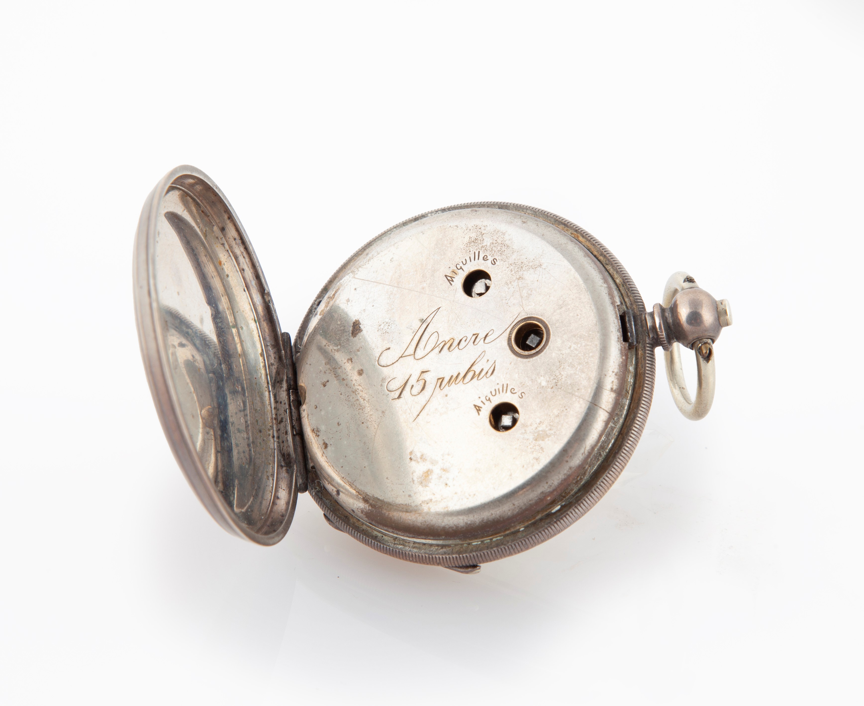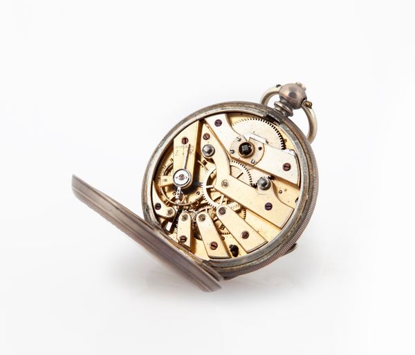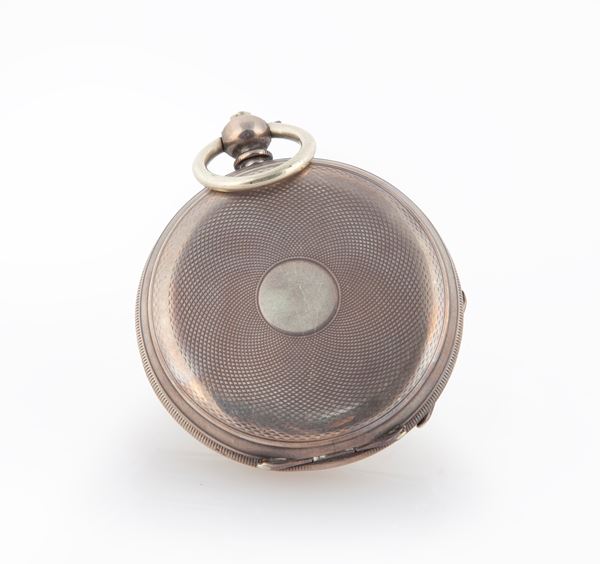 Orologio da tasca con cassa in argento con meccanica a doppio fuso orario. Scappamento ad ancora, 15 rubini, e bilanciere con viti. Carica a chiavetta con secondi in basso. Quadrante in smalto con decori coi numeri romani e quadrantini delle ore per il mercato turco, 1870 circa