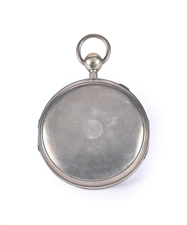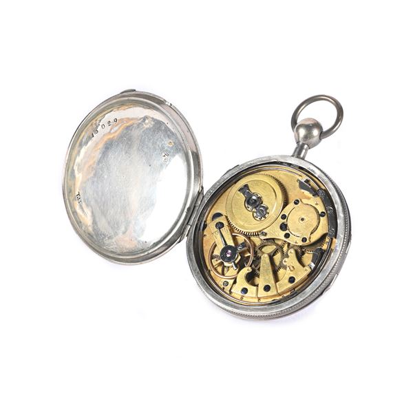 Orologio da tasca in argento movimento a ripetizione a quarti su gong, carica a chiavetta scappamento a cilindro. Quadrante in smalto con numeri arabi e lancette Breguet, 1860 circa