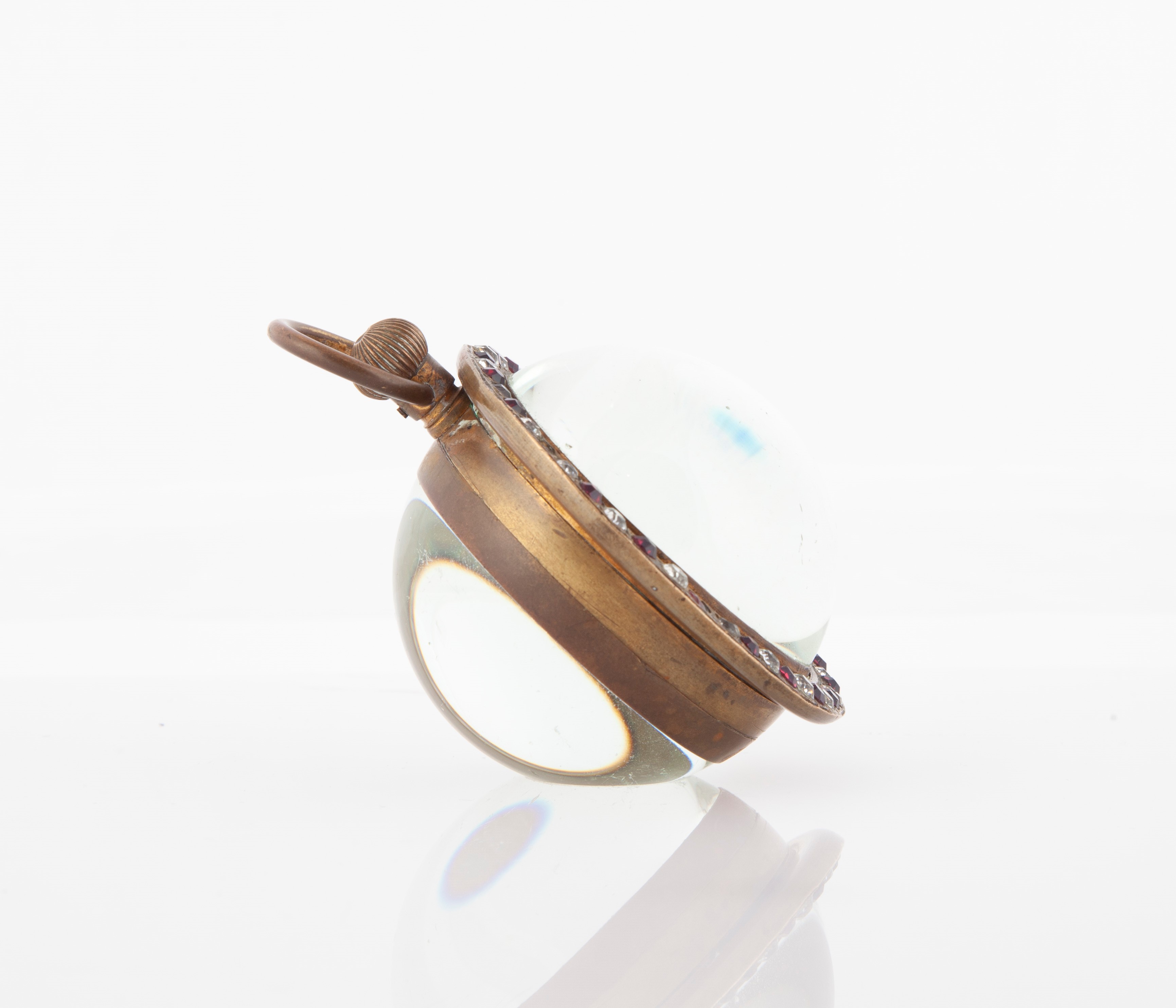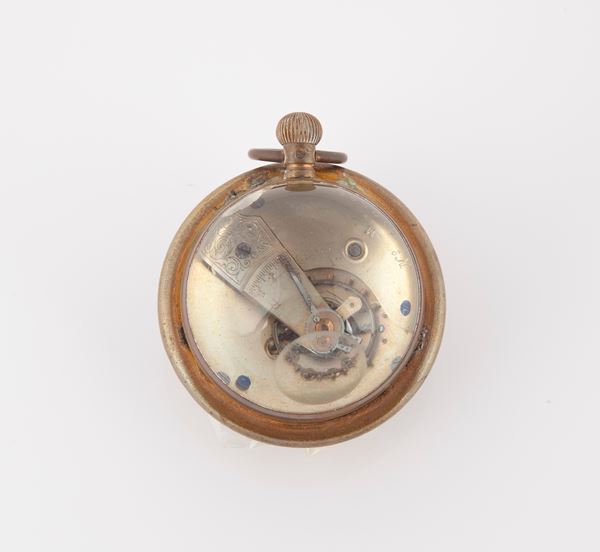 Orologio da tavolo sferico in metallo e vetro. Movimento con scappamento ad ancora, bialanciere con viti e spirale piana. Carica remontoir. Quadrante ad occhi di gatto con numeri dipinti, lancette a pera e secondi ad ore 6., 1920/30 circa