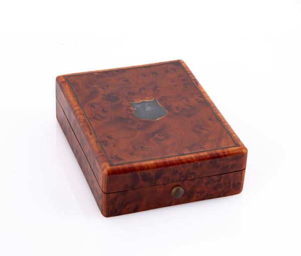 Scatola Porta orologio in legno e radica con stemma e filettature in metallo, fine XIX secolo