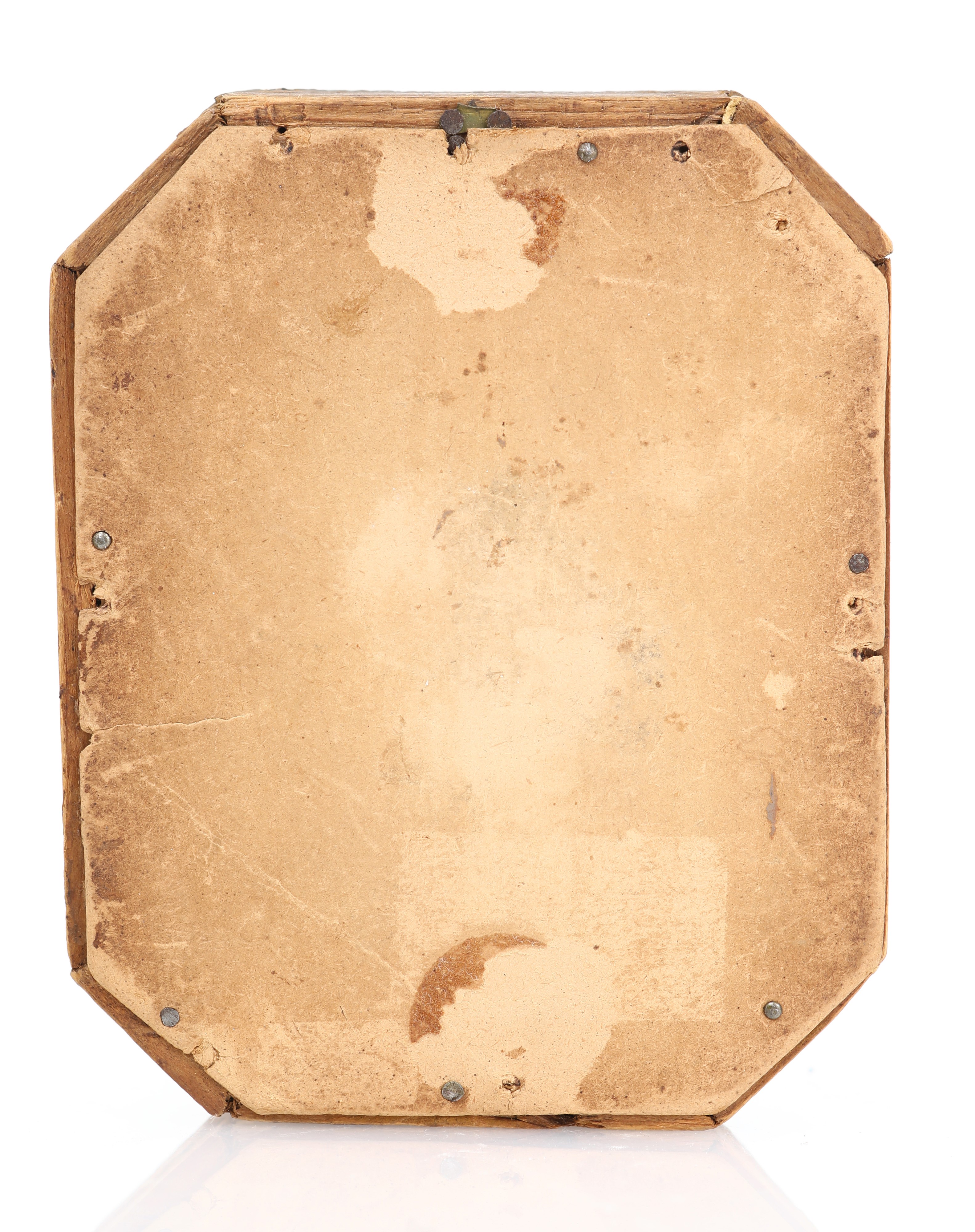 medaglione ovale in cera raffigurante Madonna col Bambino e una figura di Santa inginocchiata, racchiuso in un doppio castone di ispirazione orafa in carta dorata percorso da minuscoli riccioli in filigrana; tutt'intorno si dispongono elementi circolari simmetricamente sovrapposti a formare dei petali, impreziositi da inserti argentei e variopinti a simulare gemme; cornice a cassetta in legno dorato con rilievi decorativi in pastiglia, chiusa da un vetro