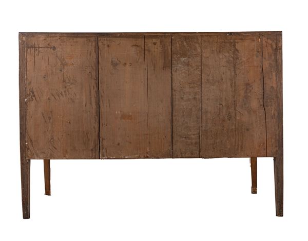 con sottili filettature intarsiate a disegnare riquadri geometrici; sul piano losanga ripetuta su i fianchi; facciata scandita da due cassetti centrati da riquadro con tarsia in contrasto a raffigurare una coppa fiorita, maniglie ad anello in bronzo; gambe rastremate. Difetti e rifacimenti