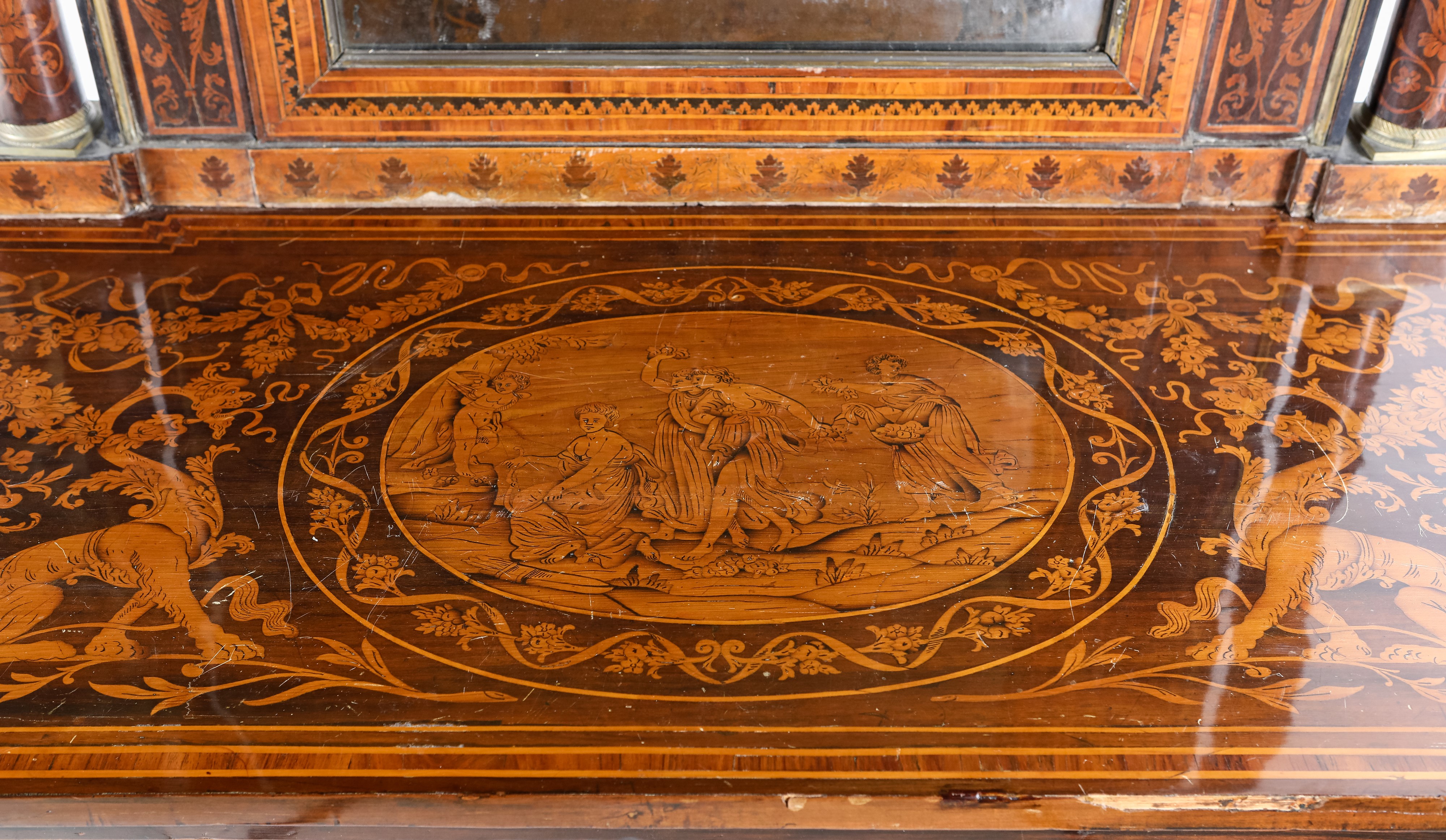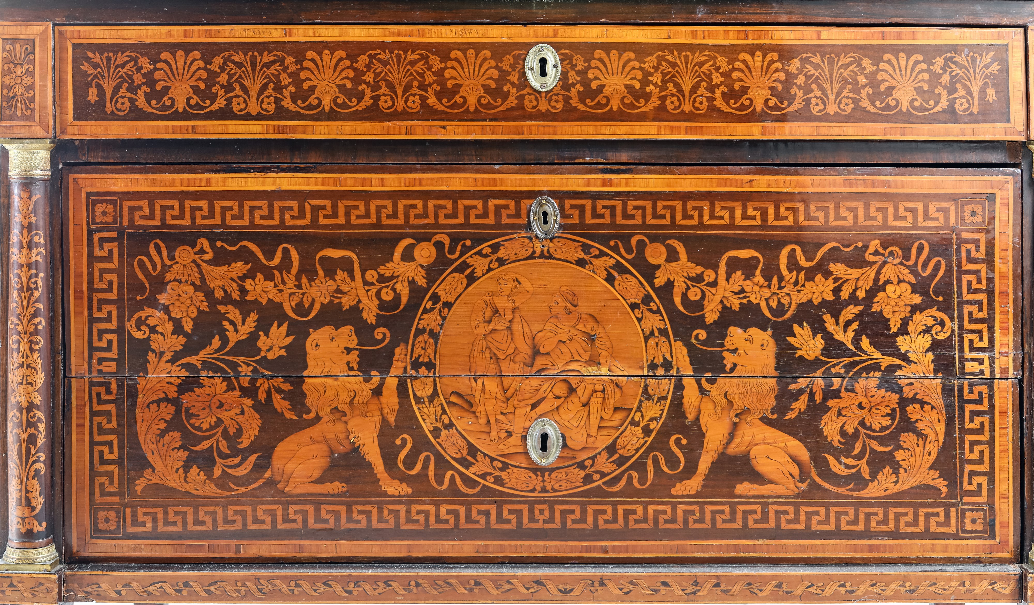 decorati da tarsie di gusto neoclassico su ogni partizione: la facciata del cassettone è racchiusa da una greca e reca al centro un grande medaglione con figure pirografate racchiuso da una ghirlanda fiorita; ai lati figure di leone, girali fitomorfe con corolle multiformi e nastri svolazzanti; i fianchi, incorniciati da girali, sono centrati da grandi coppe biansate idealmente poggiate su cespi vegetali incorniciati da festoni e nastri; cascatelle fiorite impreziosiscono le lesene laterali e i pilastri; un cassetto nella fascia percorso da cespi alternati a palmette e due sottostanti privi di traversa delimitati da lesene semicircolari con finiture in bronzo cesellato e dorato; piedi rastremati. La specchiera dalle analoghe caratteristiche stilistiche e decorative, è caratterizzata da una cornice a più ordini di tarsie a motivi lineari, geometrici e fitomorfi