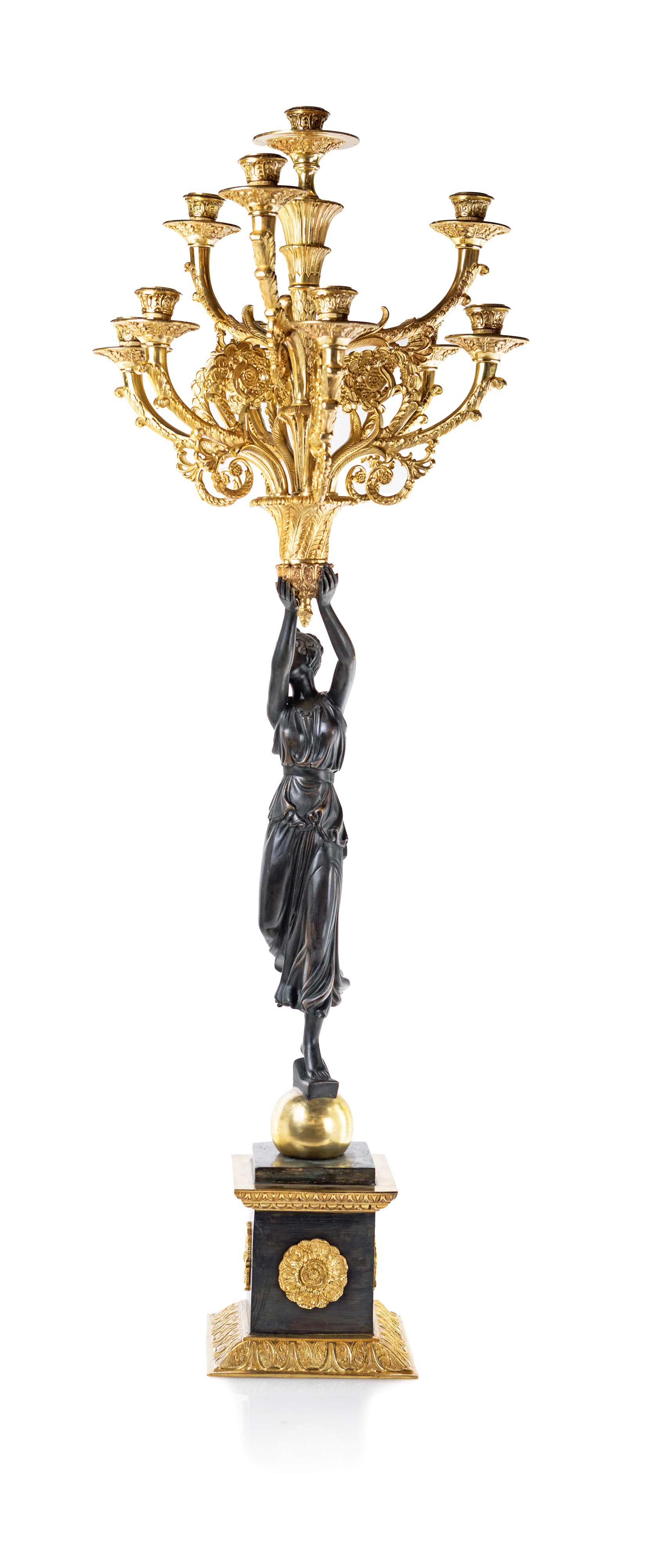 caratterizzati da figure muliebri danzanti su un globo dorato e ritratte con le braccia sollevate a sostenere un vaso da cui si dipartono i bracci reggicandela; questi sono in forma di cornucopia con estremità a ricciolo e sono arricchiti da rilievi vegetali e corolle; piedistalli squadrati decorati da rosoni e rifiniti da cornici percorse da palmette. Questa imponente coppia di flambeaux doveva presumibilmente far parte di un gruppo di quattro in quanto le figure femminili sono ritratte nella medesima postura.
