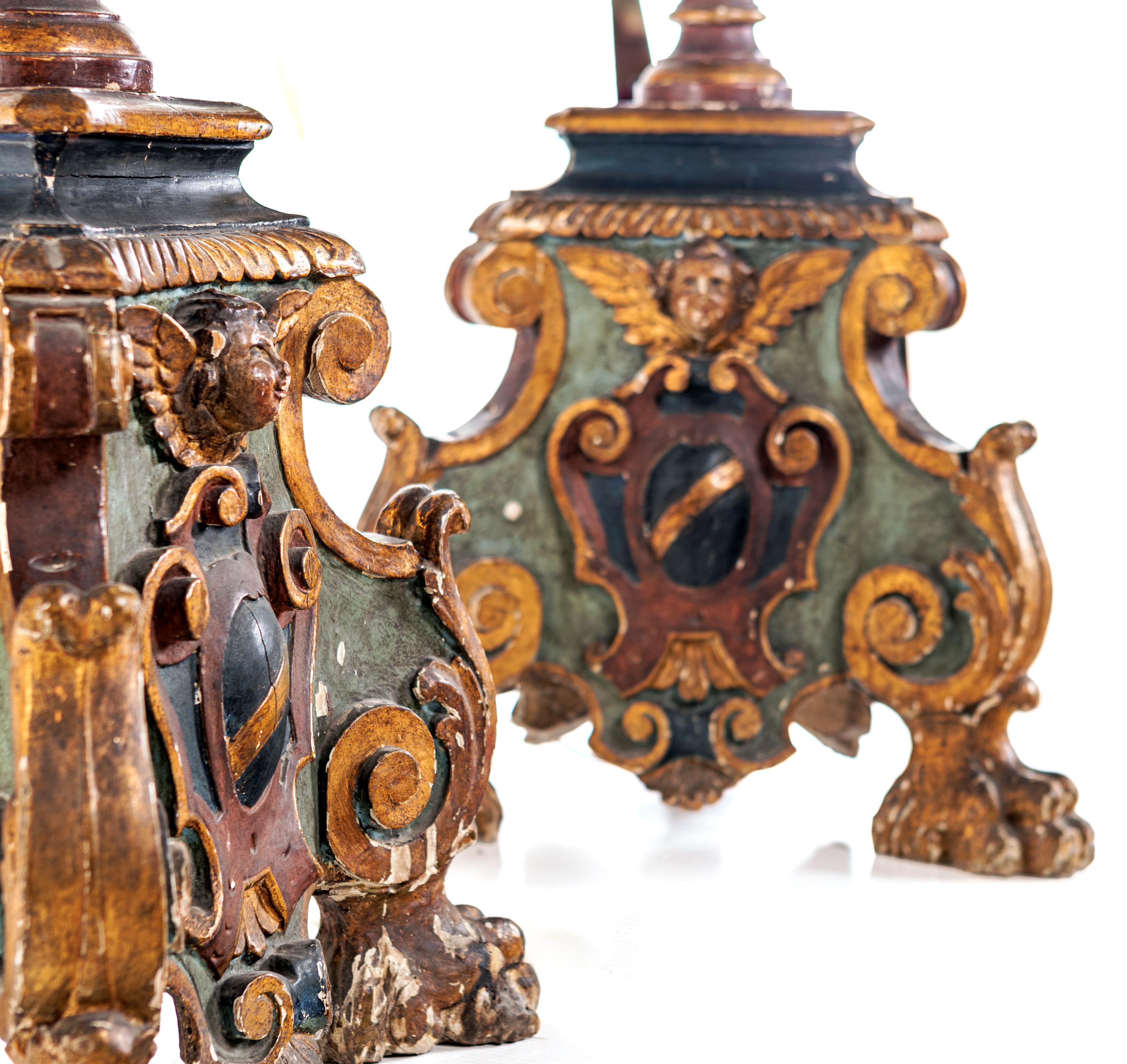 Coppia di grandi torciere in legno laccato e dorato, XIX secolo