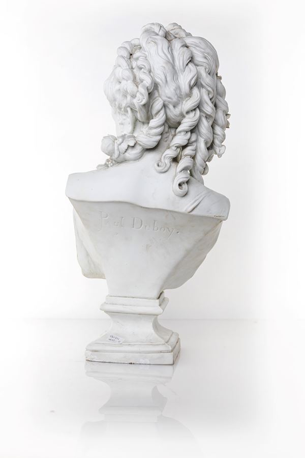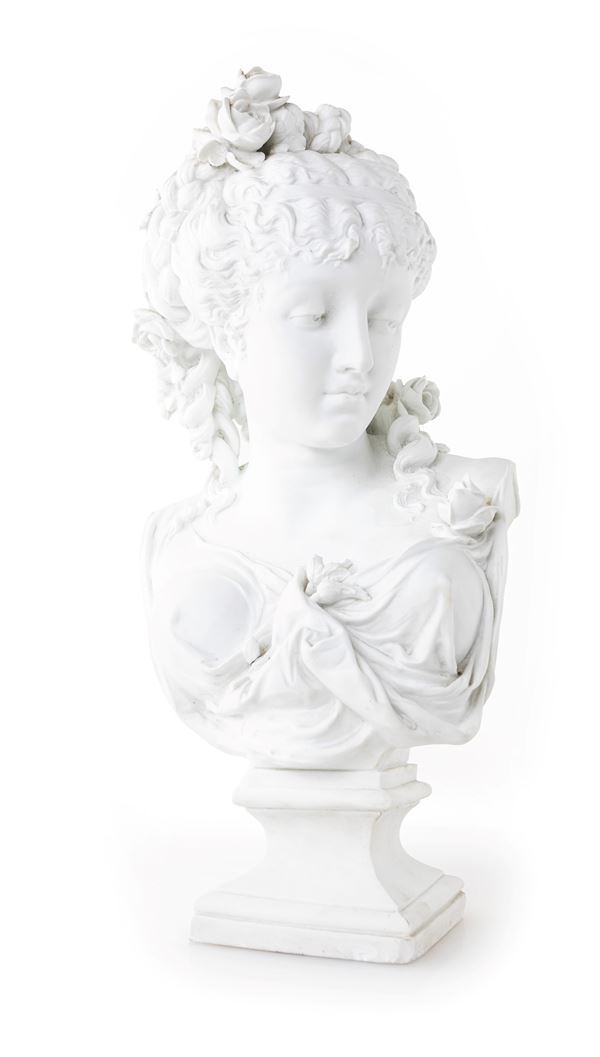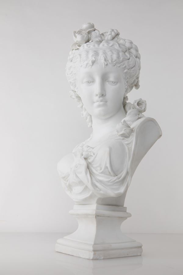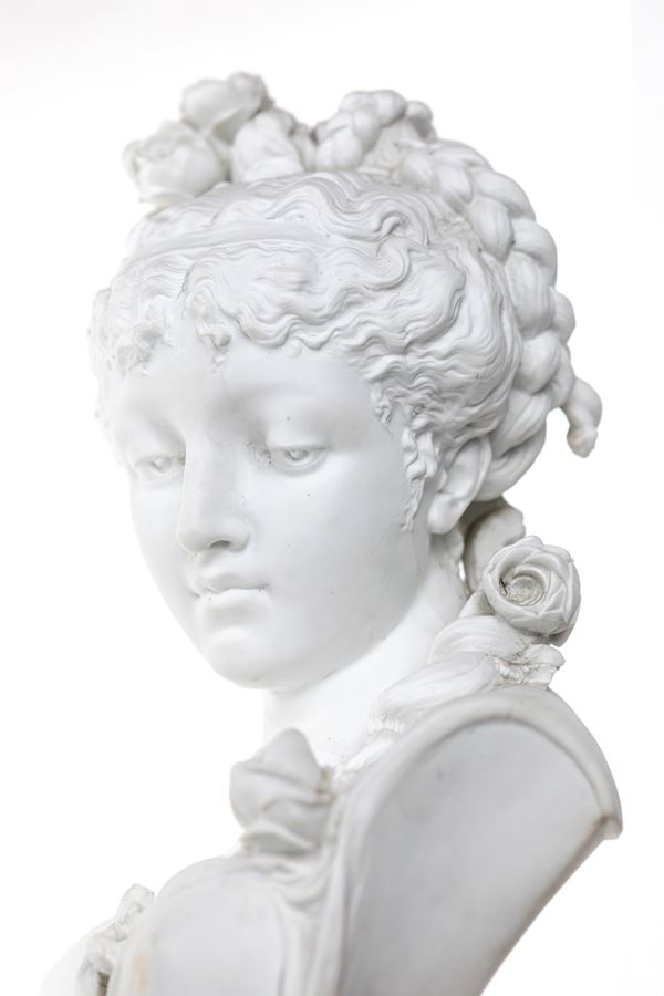 Firma incussa al verso: Paul Duboy. La giovane è ritratta con la testa rivolta verso la spalla sinistra, lo sguardo schivo orientato verso il basso; la veste leggera drappeggiata e trattenuta da fiori, elemento decorativo ripreso sulla capigliatura, parzialmente raccolta in trecce annodate sulla testa da cui ricadono ciocche avvolte in boccoli; piedistallo a rocchetto squadrato