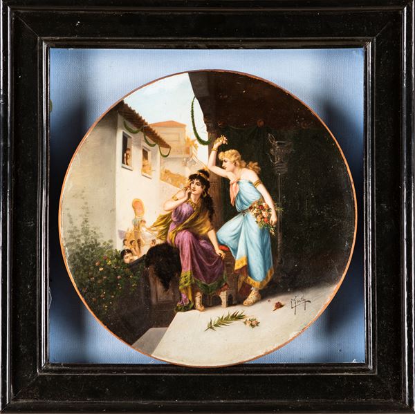 Firmato in basso a destra: E. Forti. Entro cornice quadrangolare in legno laccato nero. Edoardo Ettore Forti è autore di dipinti di genere neo pompeiano, attivo nella Roma tra la fine del XIX e l’inizio del XX secolo. La sua pittura è tutta incentrata sulla riproduzione di ambientazioni antiche sulla scia del successo ottenuto da Sir Lawrence Alma-Tadema (1836-1912) dopo i ritrovamenti di Pompei