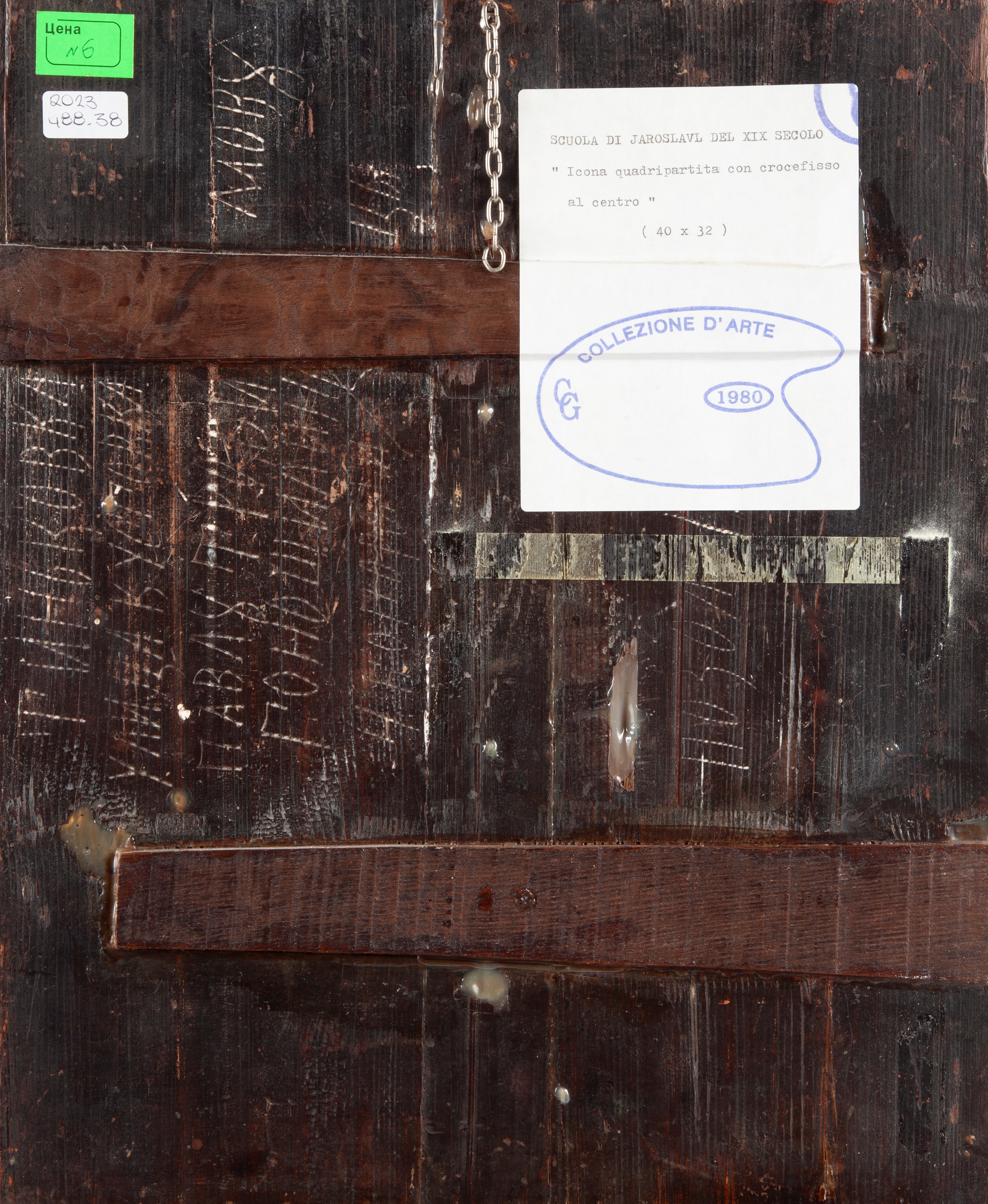 al centro, sotto Dio padre benedicente, Cristo sulla croce; ai lati due figure di santi che guardano verso il centro e alla base il teschio di Adamo; ai quattro angoli raffigurazioni della madonna col Bambino. Al verso etichette di garanzia e provenienza