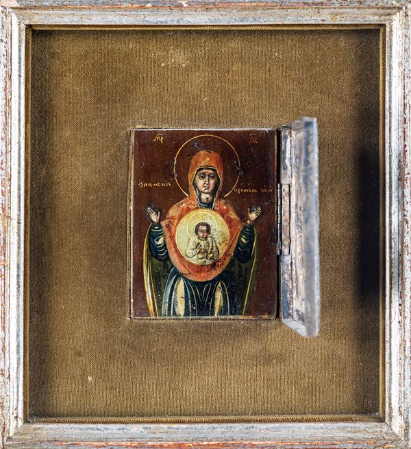 Maria è ritratta in atteggiamento orante e l'immagine del Bambin Gesù è racchiusa in un clipeo posto all'altezza del suo ventre; ritza in rame sbalzato