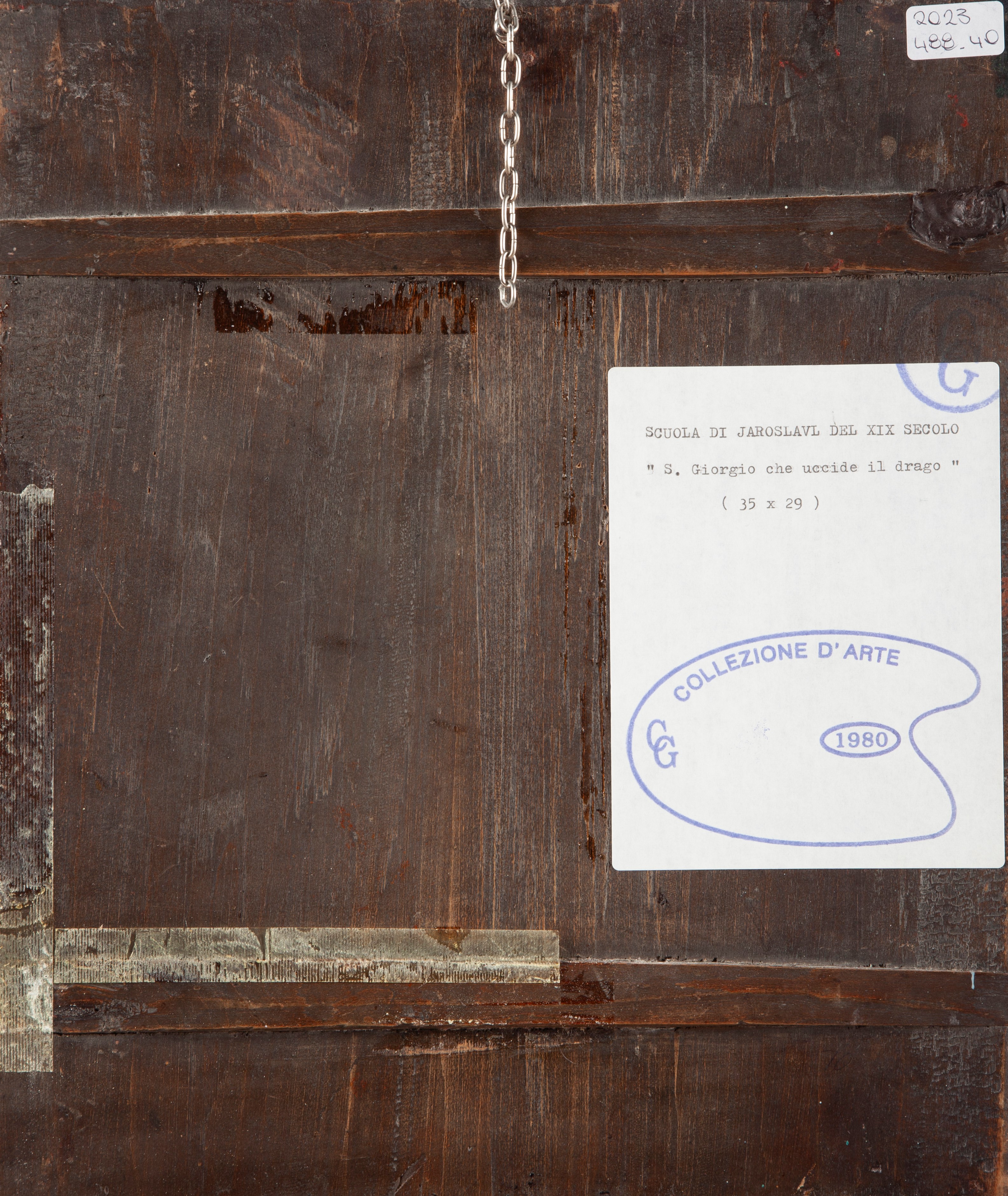 Al centro la figura del Santo guerriero su cavallo bianco mentre trafigge il drago; la principessa liberata appare nella nicchia a destra; Cristo si affaccia da una sfera angolare in alto a sinistra, simbolo della grazie divina che combatte il male. Al verso etichette di garanzia e provenienza