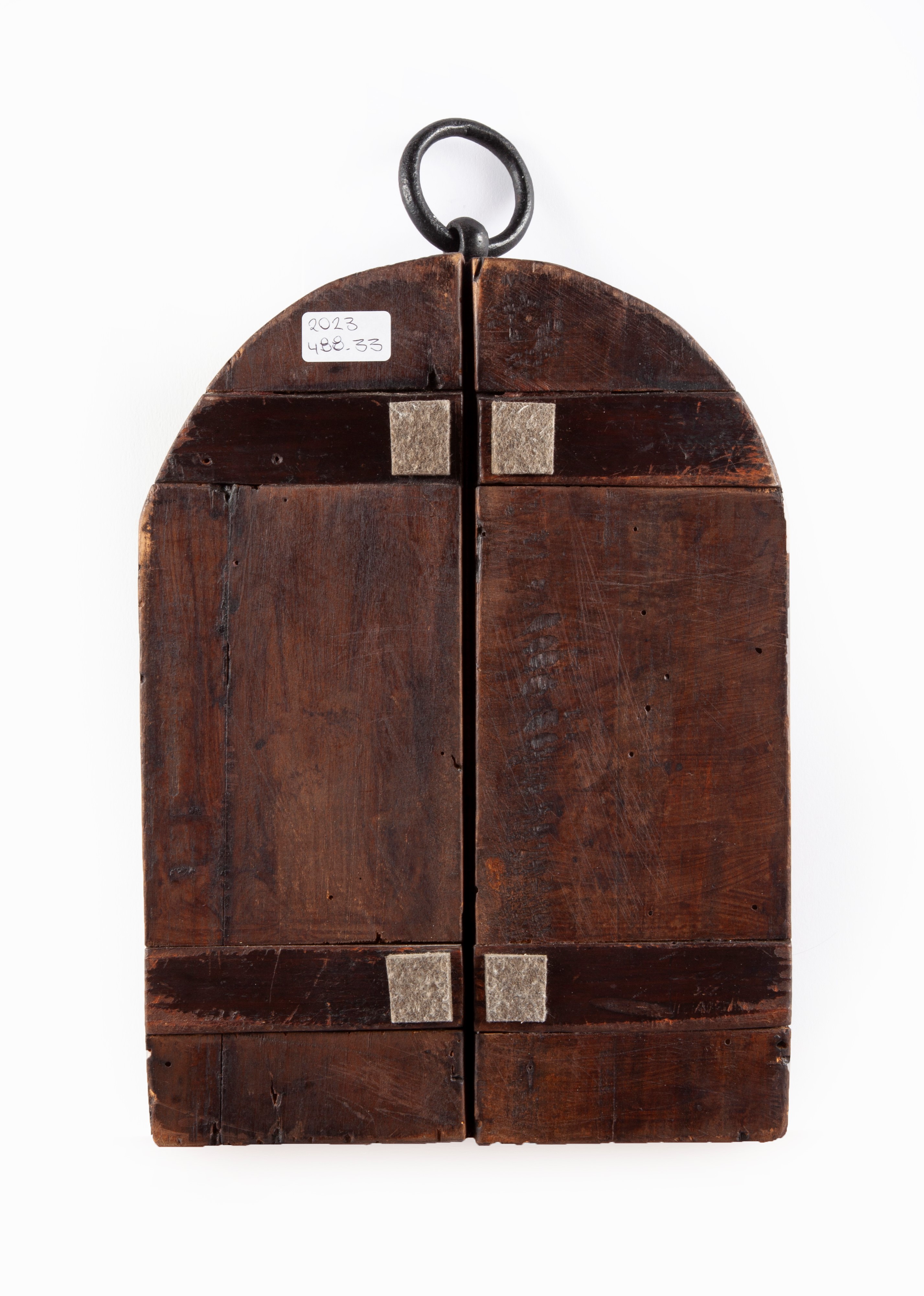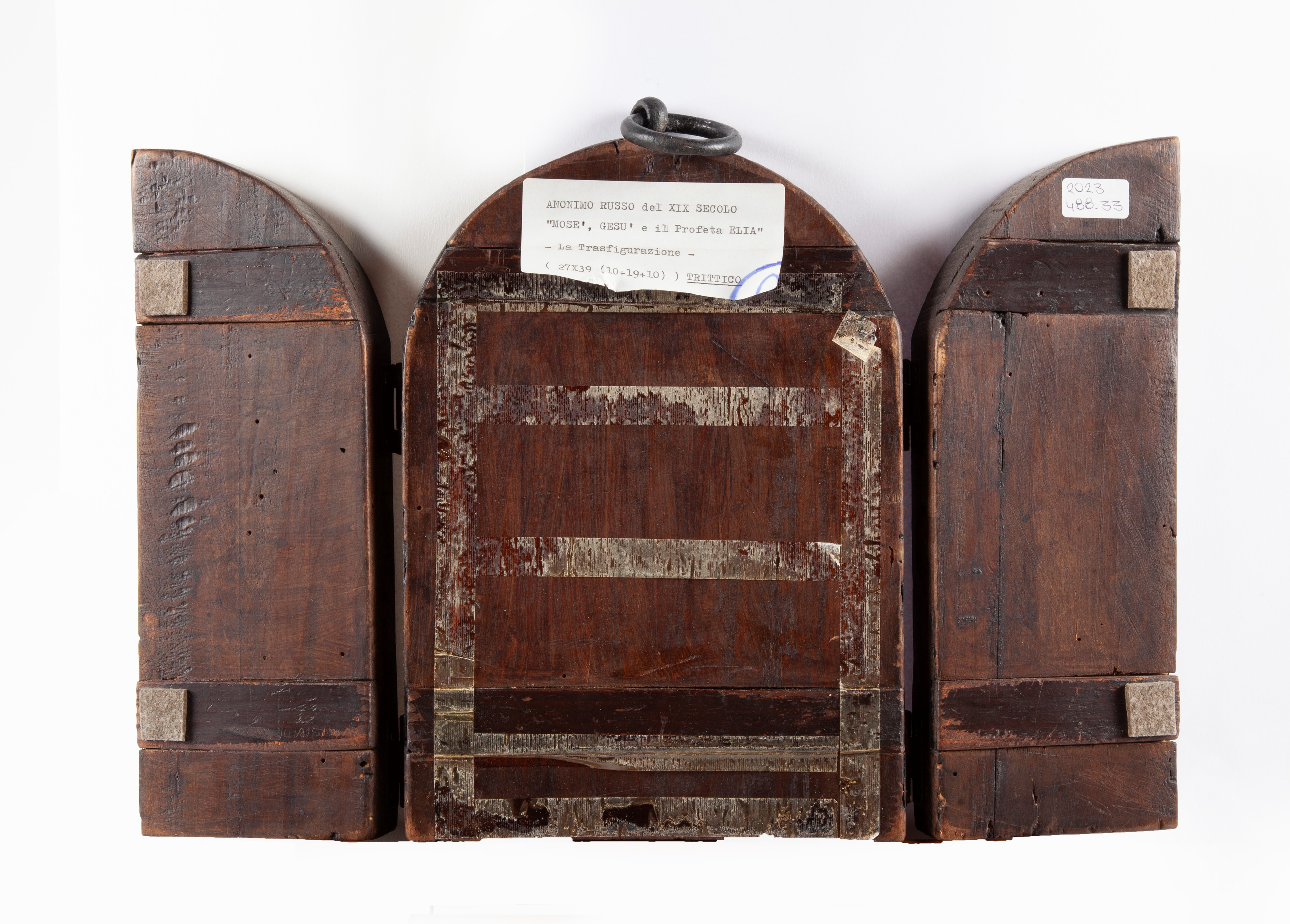 Al centro la figura di Gesù affiancato da Mosè ed Elia. Al verso etichette di garanzia e provenienza