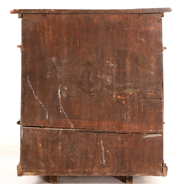 piano con profilo dentellato, fascia abbellita da un tralcio reso in bassorilievo, elemento decorativo ripreso sulla fascia inferiore e similmente riproposto sulle tre formelle che scandiscono la facciata; uno sportello mediano con scudo circondato da rilievi in forma di piume, bassi piedi a mensola. Difetti e restauri