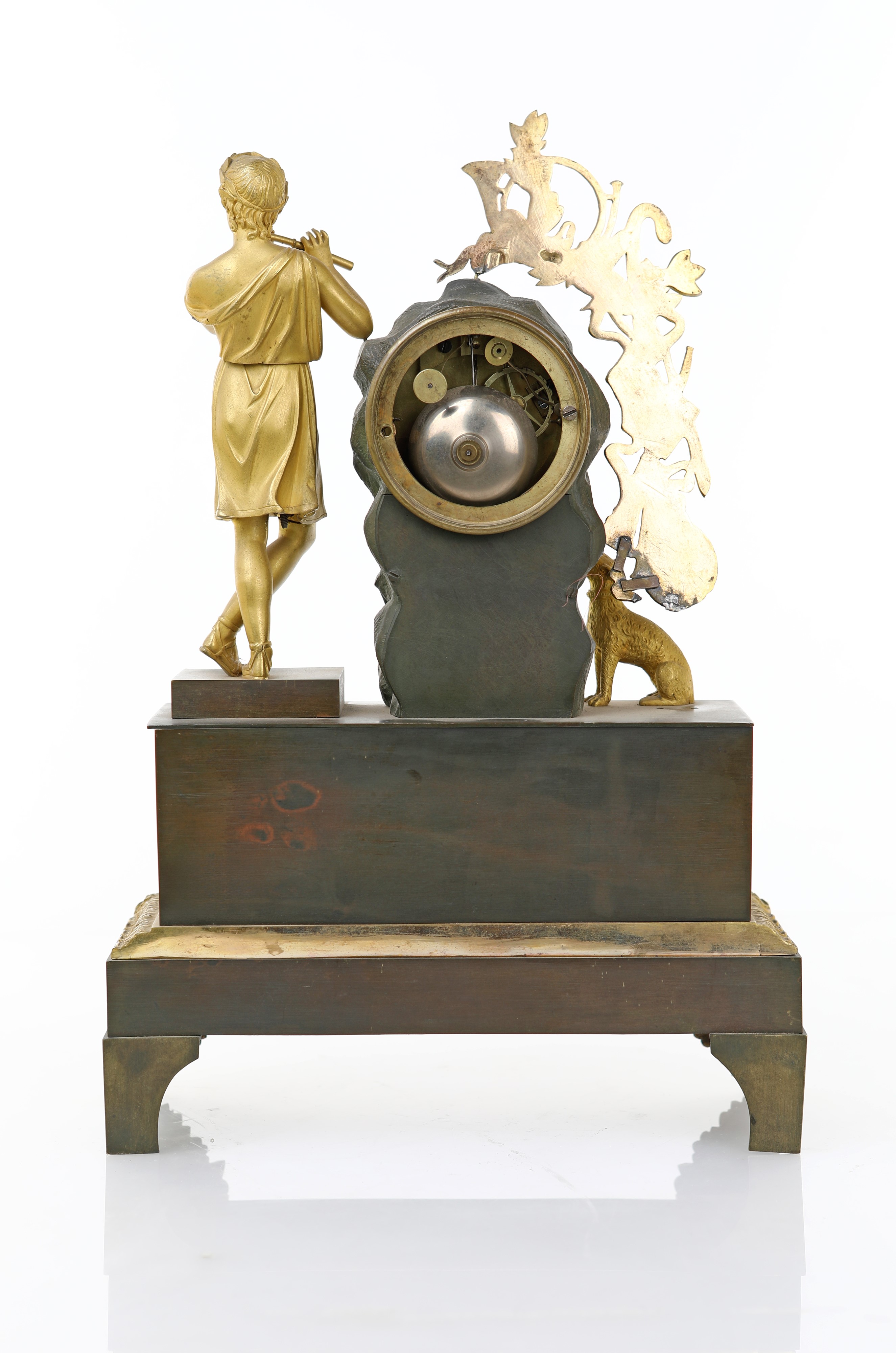 Caratterizzato da figura di giovane satiro nell'atto di suonare il flauto; cassa simulante una roccia, sormontata da un fregio in forma di trofeo di strumenti musicali e affiancata da un lupo; al centro quadrante circolare a due fori di carica e indicazione oraria a numeri romani, base rettangolare impreziosita da un fregio frontale a forma di arco su cui idealmente si avvolge una ghirlanda ed un nastro svolazzante; piedi a mensola cesellati. Meccanica francese a otto giorni, movimento con suoneria a ore e mezze al passaggio, scappamento ad ancora e sospensione a filo di seta. Una lancetta mancante.
