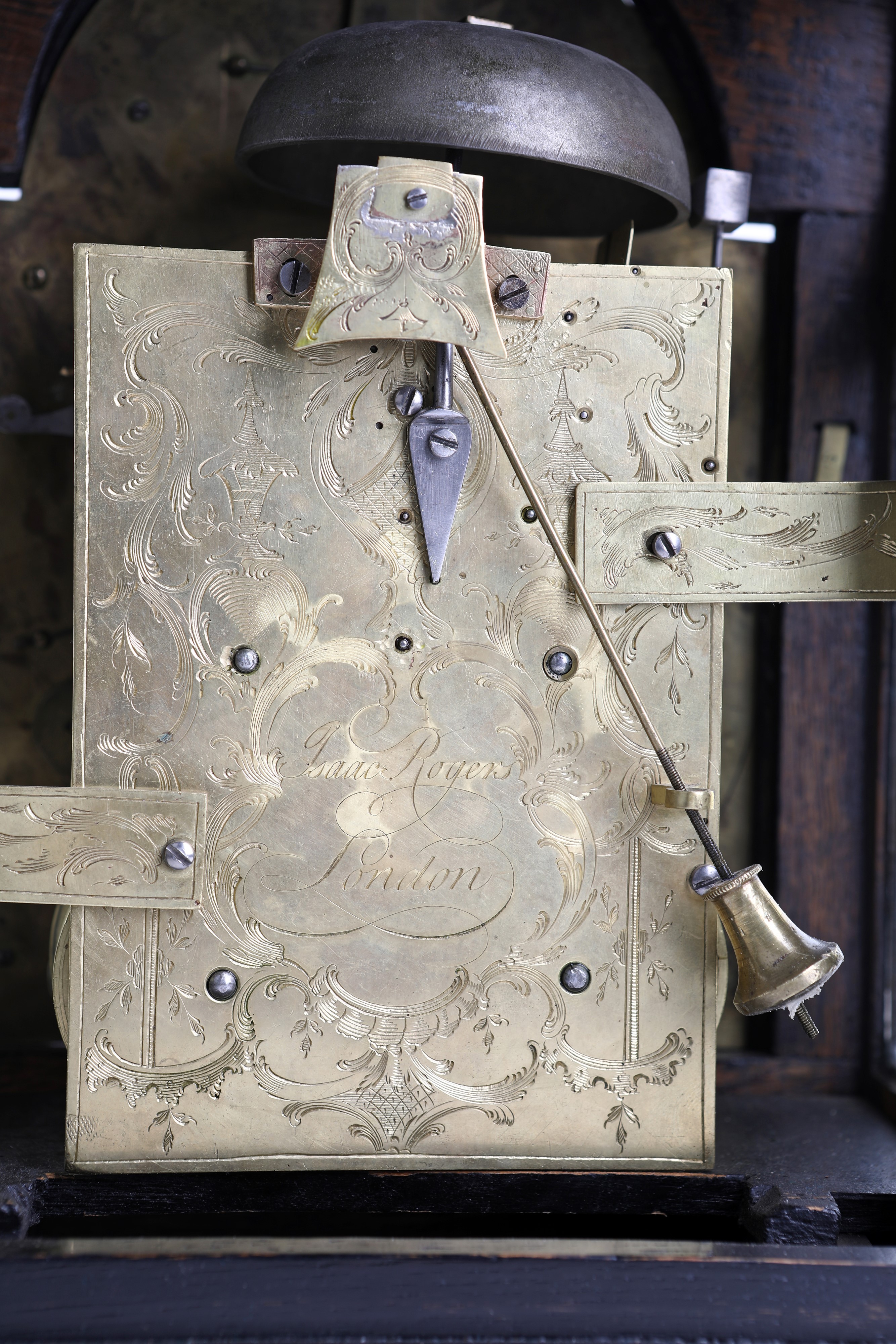 quadrante dorato con fascia oraria argentata ed incisa a numeri romani; lancette in ferro traforate, decori applicati in bronzo dorato, apertura per il falso pendolino e finestrella per l'indicazione del giorno del mese; quadrantino per l'esclusione della suoneria. Meccanica a otto giorni, scappamento a verga, plance posteriore incisa a motivi di foglie d'acanto, firmata Isaac Rogers London; suoneria a ore e mezze al passaggio su campana