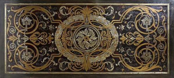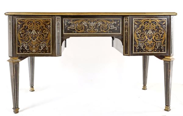 Scrivania da centro in legno ebanizzato e incrostazioni in ottone e metallo argentato, Francia, XIX secolo