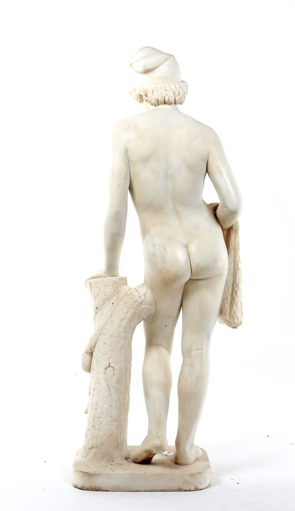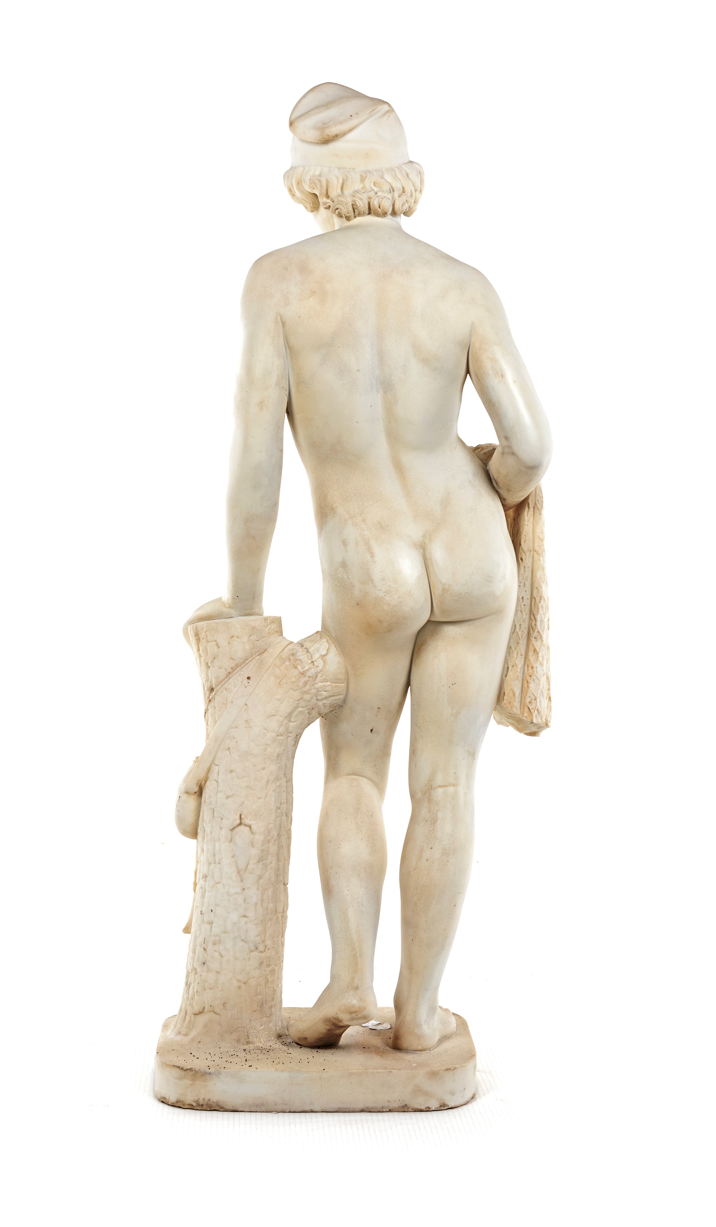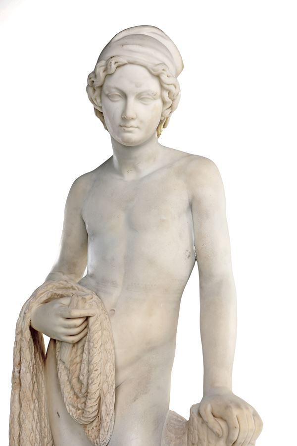 raffigurante un giovane pescatore desunto dal repertorio classico napoletano, ritratto stante col caratteristico berretto ripiegato, il braccio destro piegato a sostenere una rete ammassata verosimilmente resa; il braccio sinistro poggiato su mezzo tronco d'albero su cui emergono pesci resti in bassorilievo; base circolare