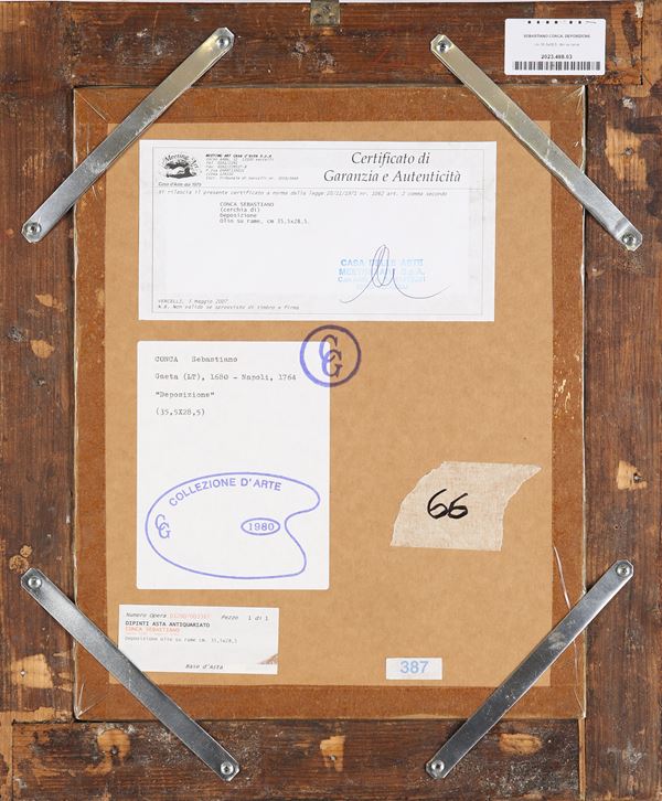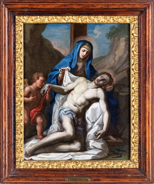 Il corpo, diafano e oramai esangue, di Gesù Cristo sorretto in modo delicato dalla Madonna, completamente vestita di blu, ricorda la una statua antica. L'attribuzione alla cerchia di Sebastiano Conca, pittore di Gaeta che trovò fortuna nella Roma settecentesca, è confermata dal confronto con opere dipinte dal maestro, in particolare la versione conservata presso la Pinacoteca Vaticana.