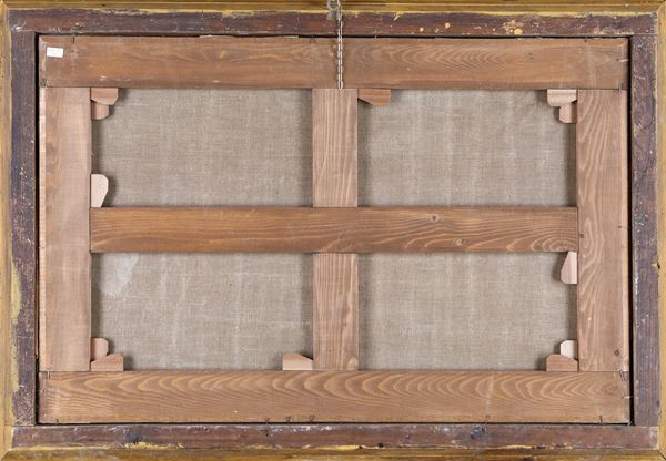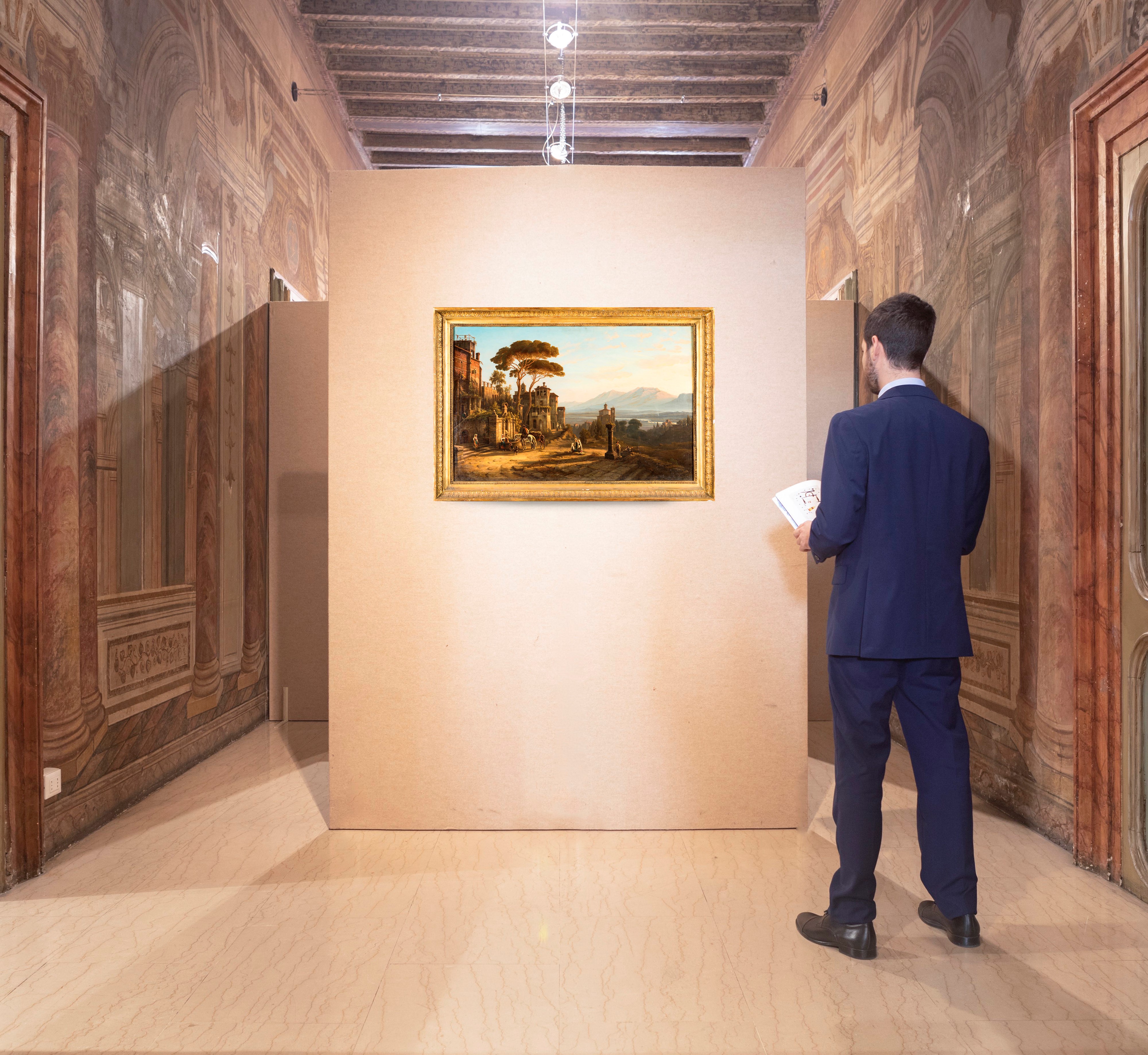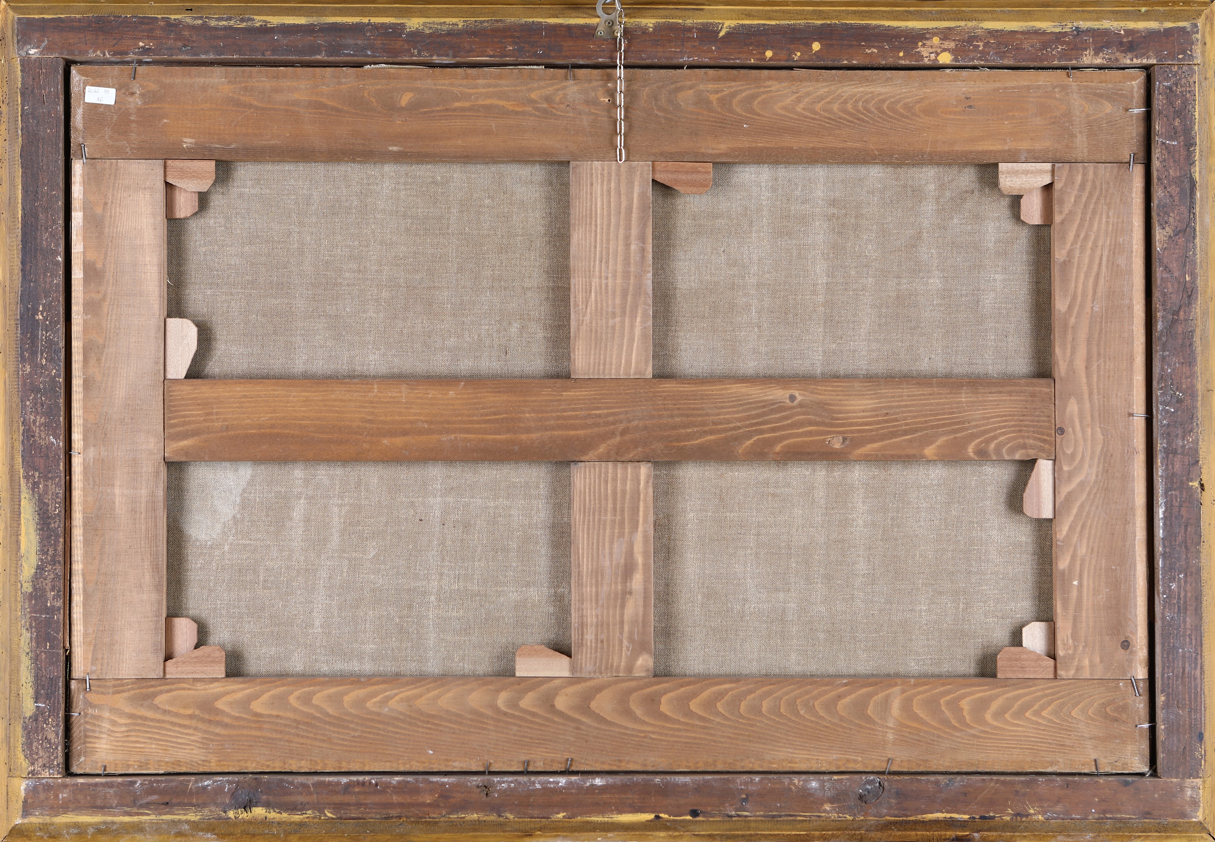 Firmato in basso: Henry Jaeckel. Veduta al tramonto di uno scorcio di campagna dell'Italia centromeridionale con abitazioni, chiesetta e montagne sullo sfondo. La grande qualità del dipinto, di un abile vedutista tedesco di cui si hanno poche notizie, è confermata dai sofisticati effetti di luce e ombra e dalla sapiente resa della lontananza delle montagne sullo sfondo.