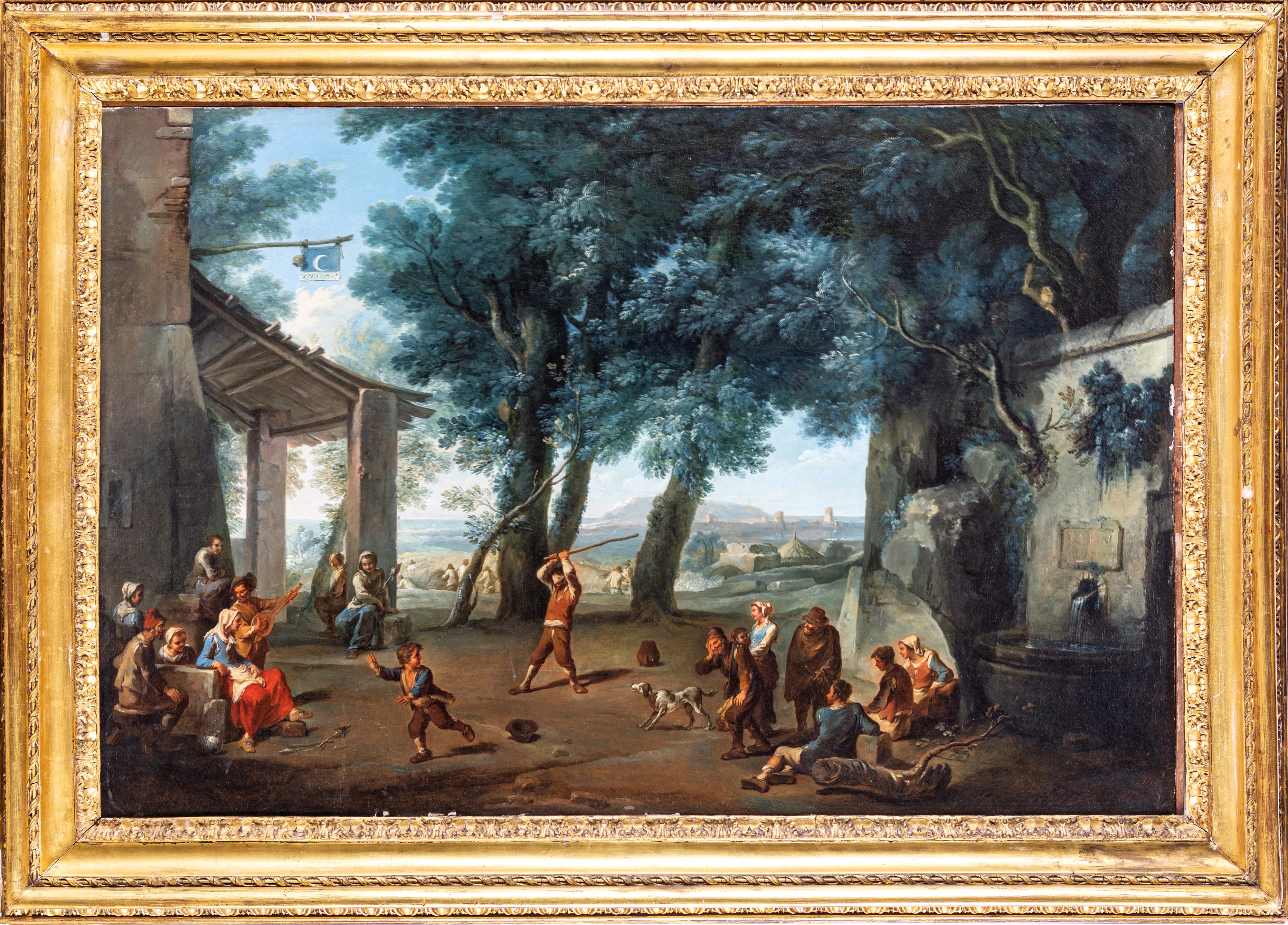 Davanti ad una taverna un giovane si diletta nel gioco della moscacieca con un piccolo bambino. Attorno a loro un gruppo di contadini si rilassa suonando e cantando, mentre sulla destra, davanti ad una fonte da cui sgorga dell'acqua, dei popolani sembrano intendi a godersi la scena. Sullo sfondo, dipinti quasi en grisaille, degli uomini sono ancora a lavoro mentre mietono del grano. L'autore di questa tela, rintracciabile sia per l'inconfondibile stile che per il monogramma posto su una brocca in basso a sinistra, è Paolo Monaldi, pittore romano del XVIII secolo formatosi presso la bottega di Paolo Anesi. Ci troviamo probabilmente di fronte ad uno dei più bei quadri da cavalletto eseguito dall'artista. La maestria con sui costruisce i vari piani prospettici, le calibrate tonalità delle fronte e del cielo, la caratterizzazione di ogni personaggi si staglia su alcuni esemplari di altri pittori e con la medesima iconografia.