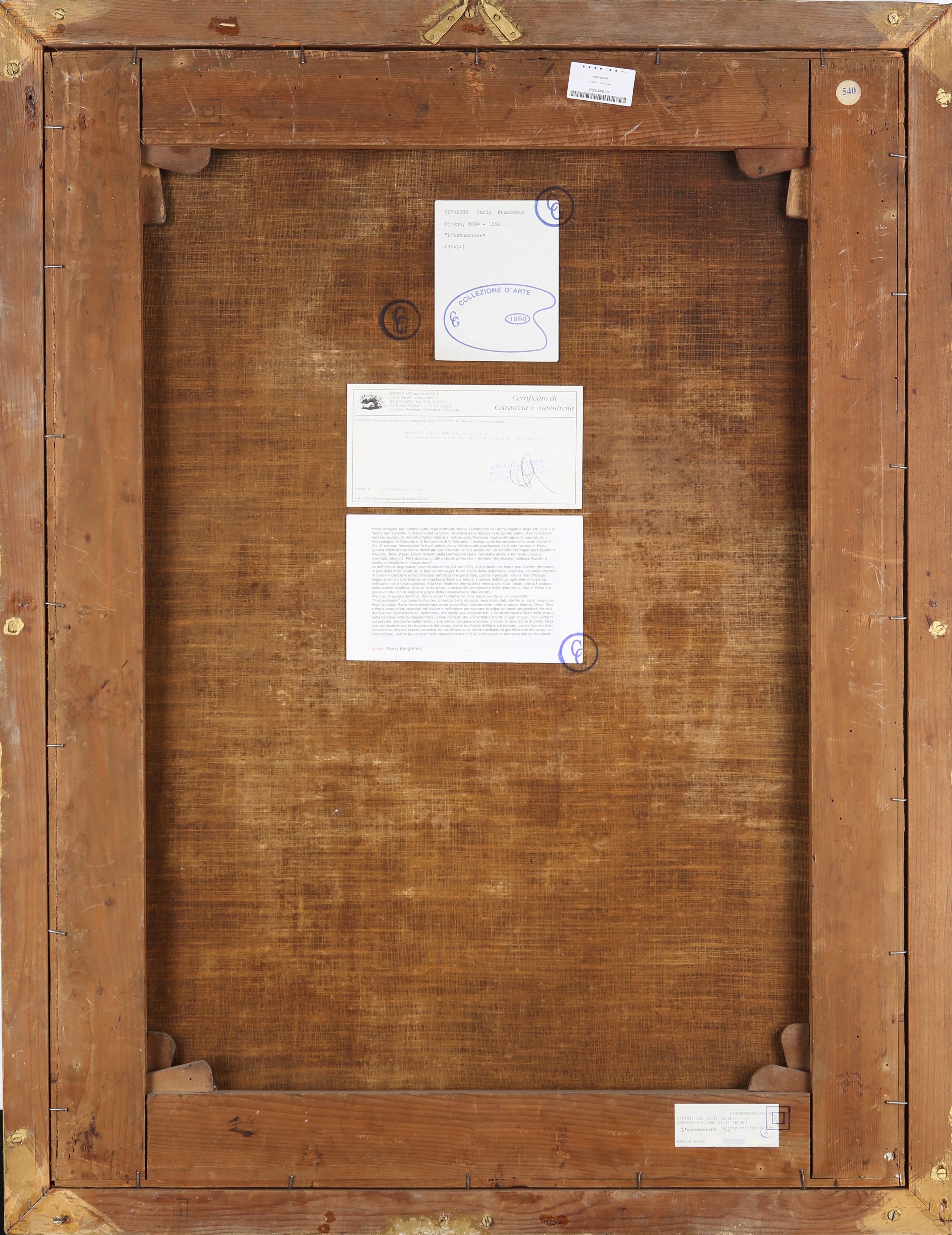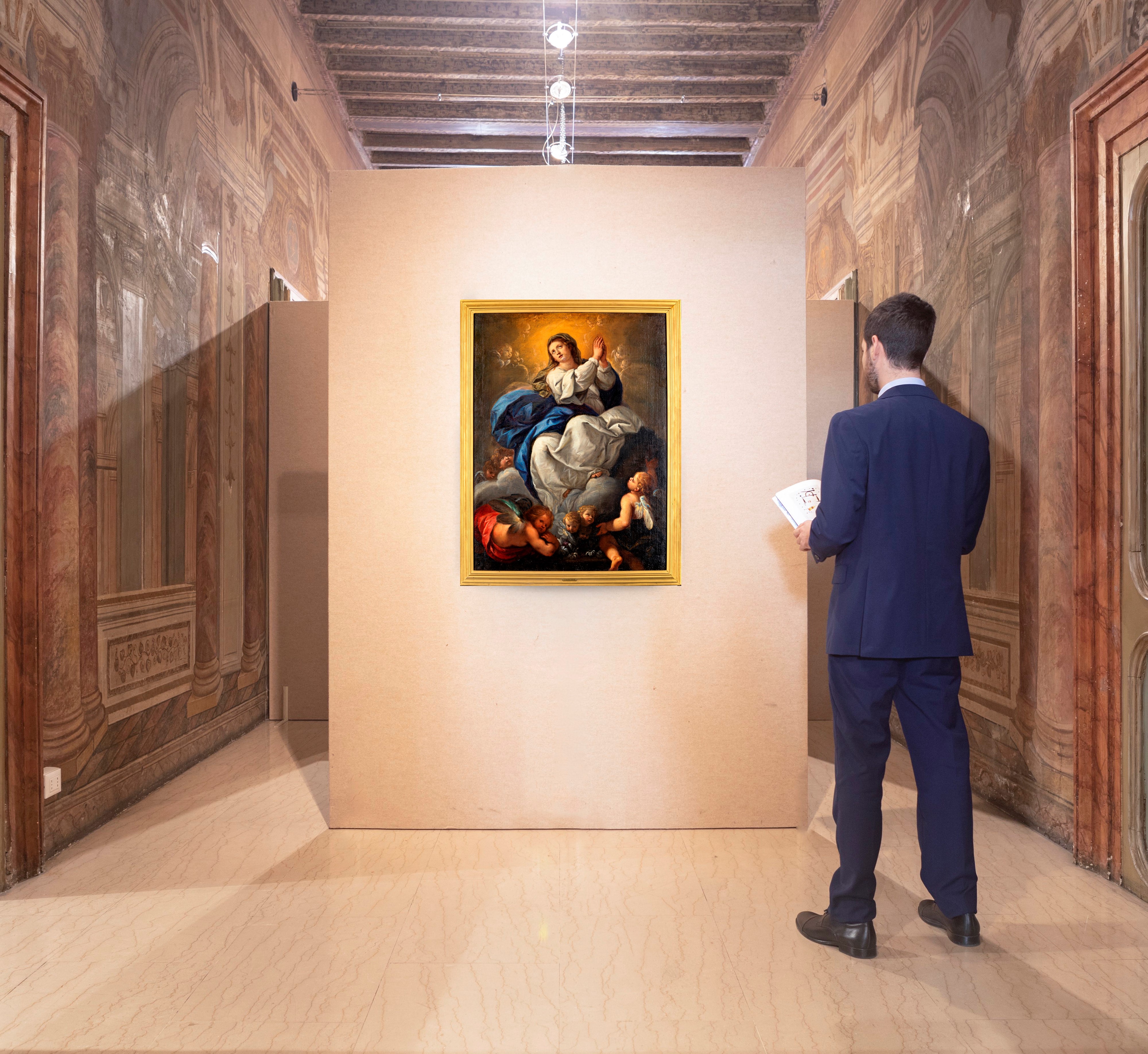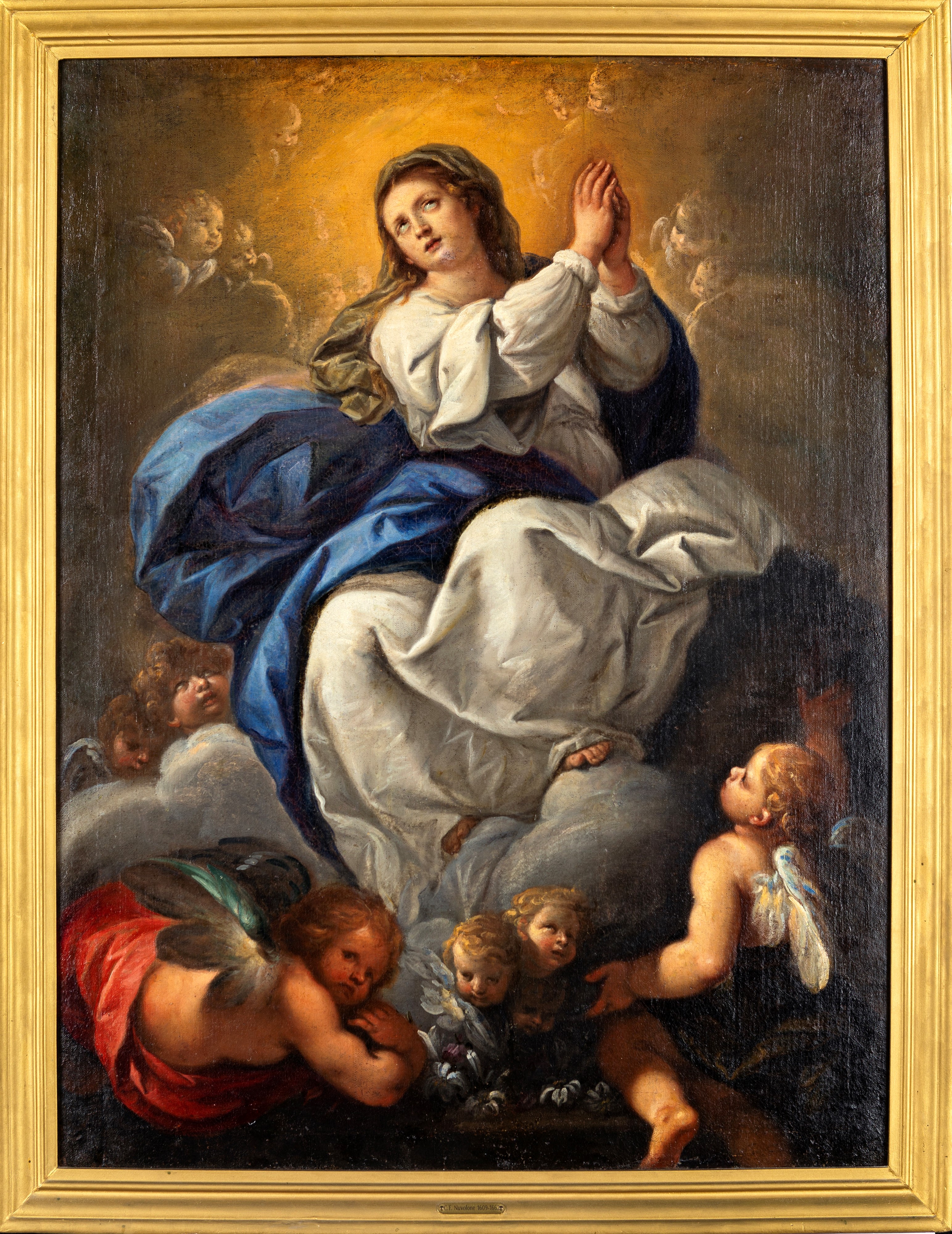 Dal cielo illuminato da una luce gialla emerge con grande forza la figura della Madonna, vestita riccamente con una veste blu e bianca, assisa sul un trono di nubi, contornata da putti. Le pennellate morbide ma decise, unito a sfumature cromatiche che delineano le figure, avvicinano la tela alla migliore produzione pittore di Carlo Francesco Nuvolone, grande interprete del barocco milanese.