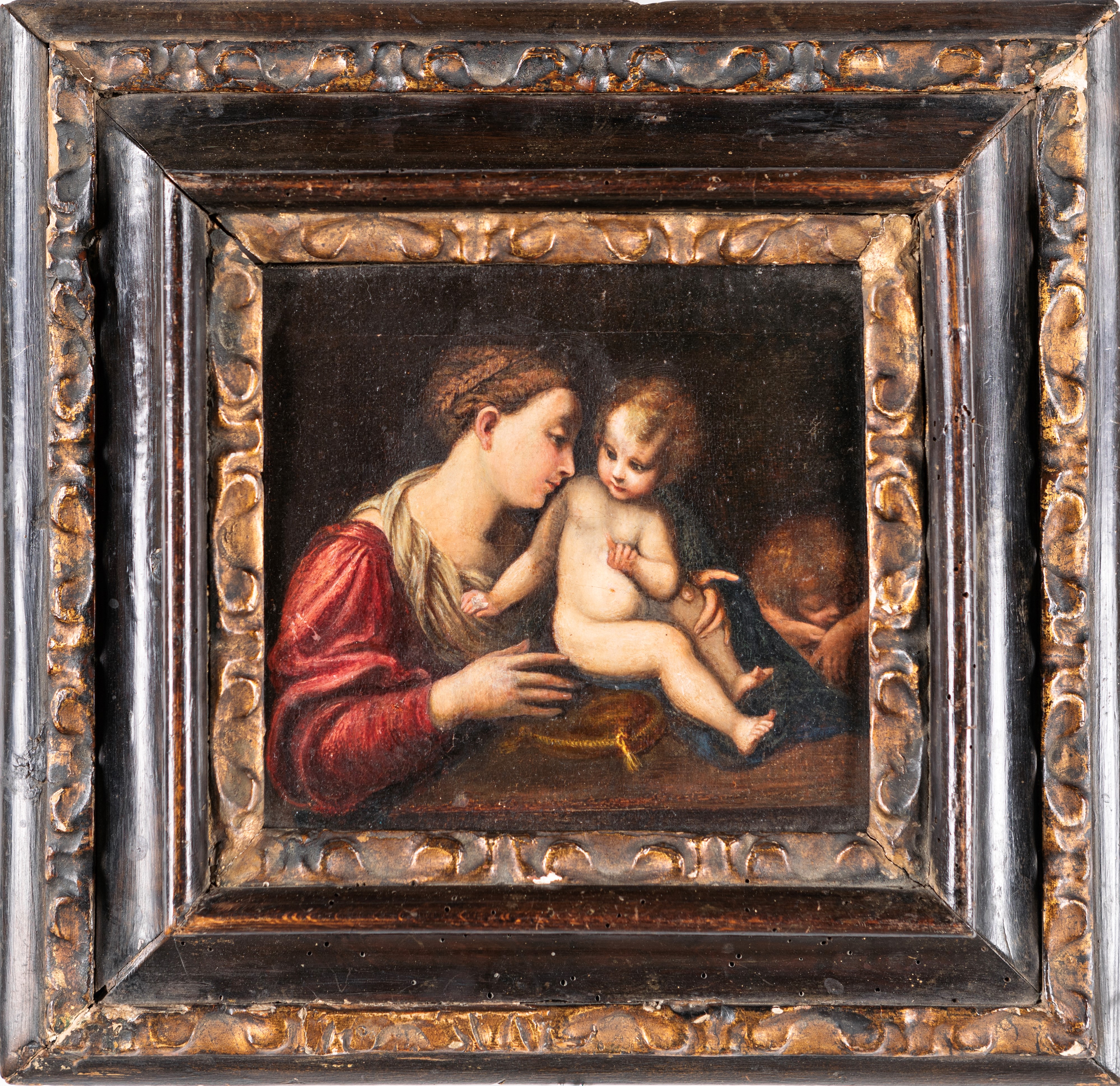 Il nostro dipinto, raffigurante una tenera conversazione muta tra la Madonna con Gesù Bambino, è una replica seicentesca di un'opera oggi custodita a Palazzo Pitti a Firenze, attribuita a Gaudenzio Ferrari. L'autore della versione qui proposta è da ritenersi di scuola genovese per la delicatezza degli incarnati e la tonalità levigate.