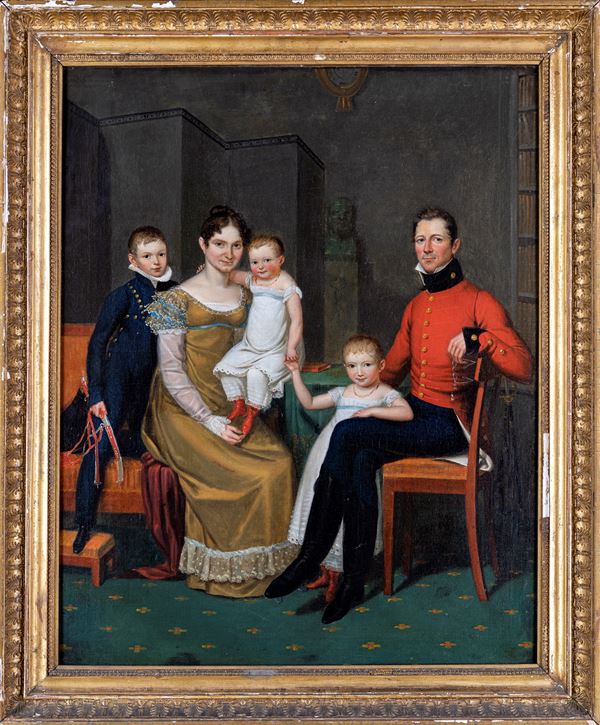 Il pregiato dipinto raffigura i membri di una famiglia, espressivi e ben vestiti, ritratti all'interno di una abitazione borghese. L'opera rappresenta un interessante esempio della ritrattistica di famiglia dei primi decenni dell'Ottocento, in cui vediamo il configurarsi di una declinazione più intimistica e domestica rispetto ai fastosi esempi dei dipinti del primo Neoclassicismo. Il carattere di semplicità e, potremmo dire, "understatement" della raffigurazione della famiglia, priva di sfarzo ma non di dignità, molto suggerisce sui profondi cambiamenti sociali di quei movimentati decenni. La tela, ben conservata, si presenta entro una cornice in legno dorato, coerente con la pittura e databile ai primi decenni dell' 800.