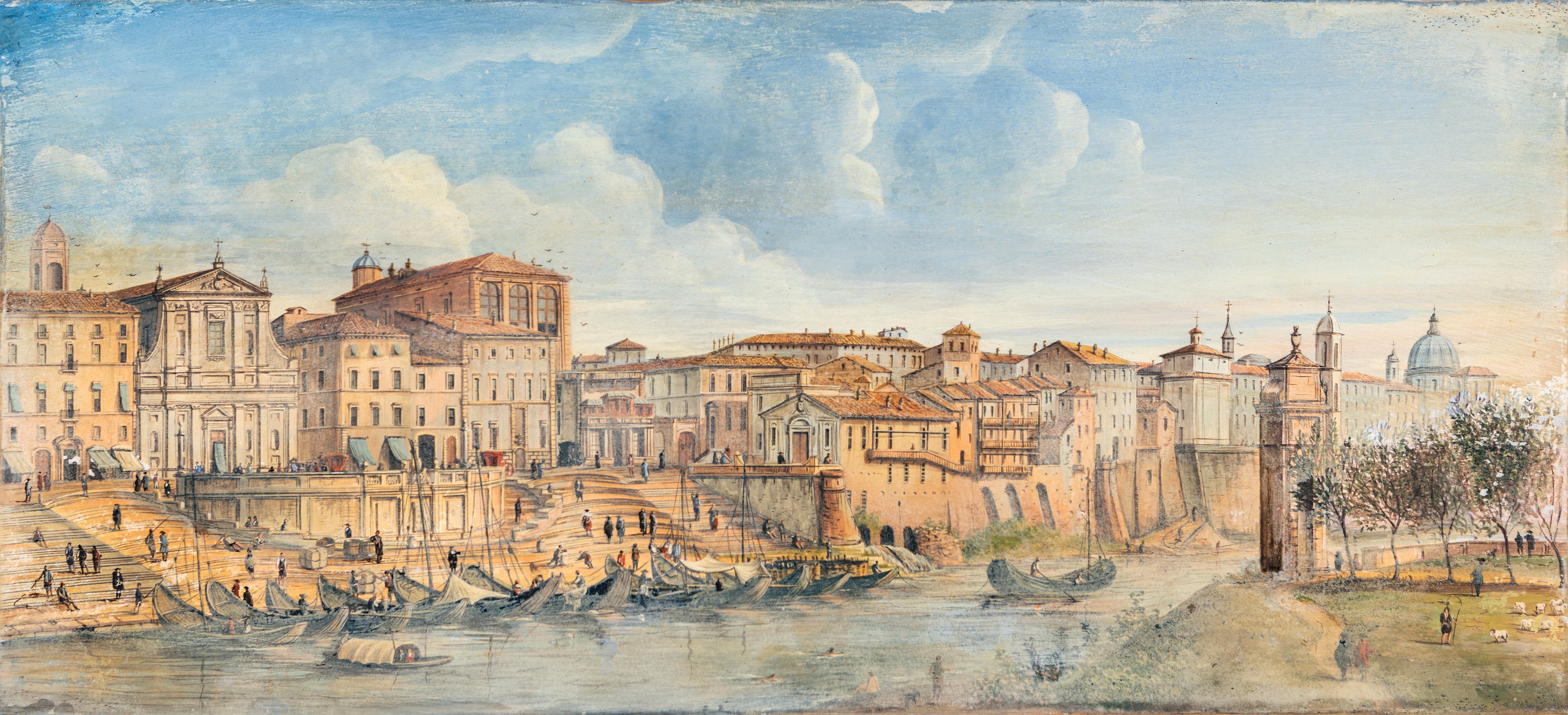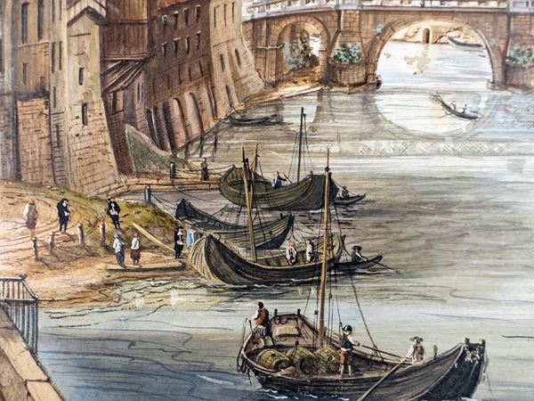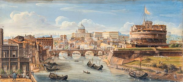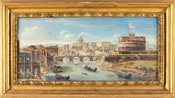 Coppia di tempere su pergamena Veduta di Castel Sant'Angelo e del Porto di Ripetta