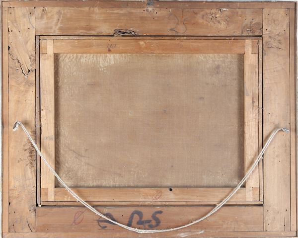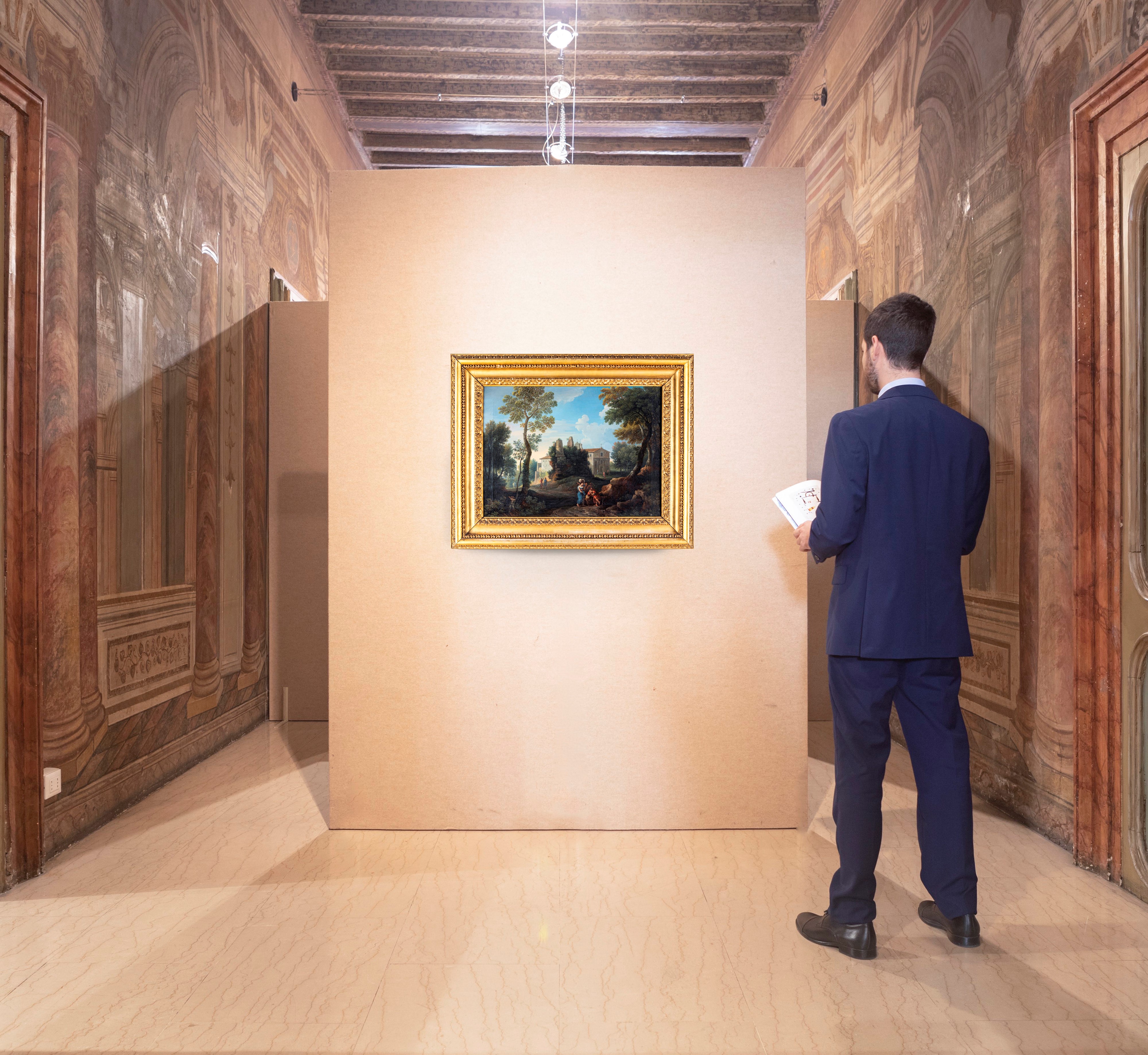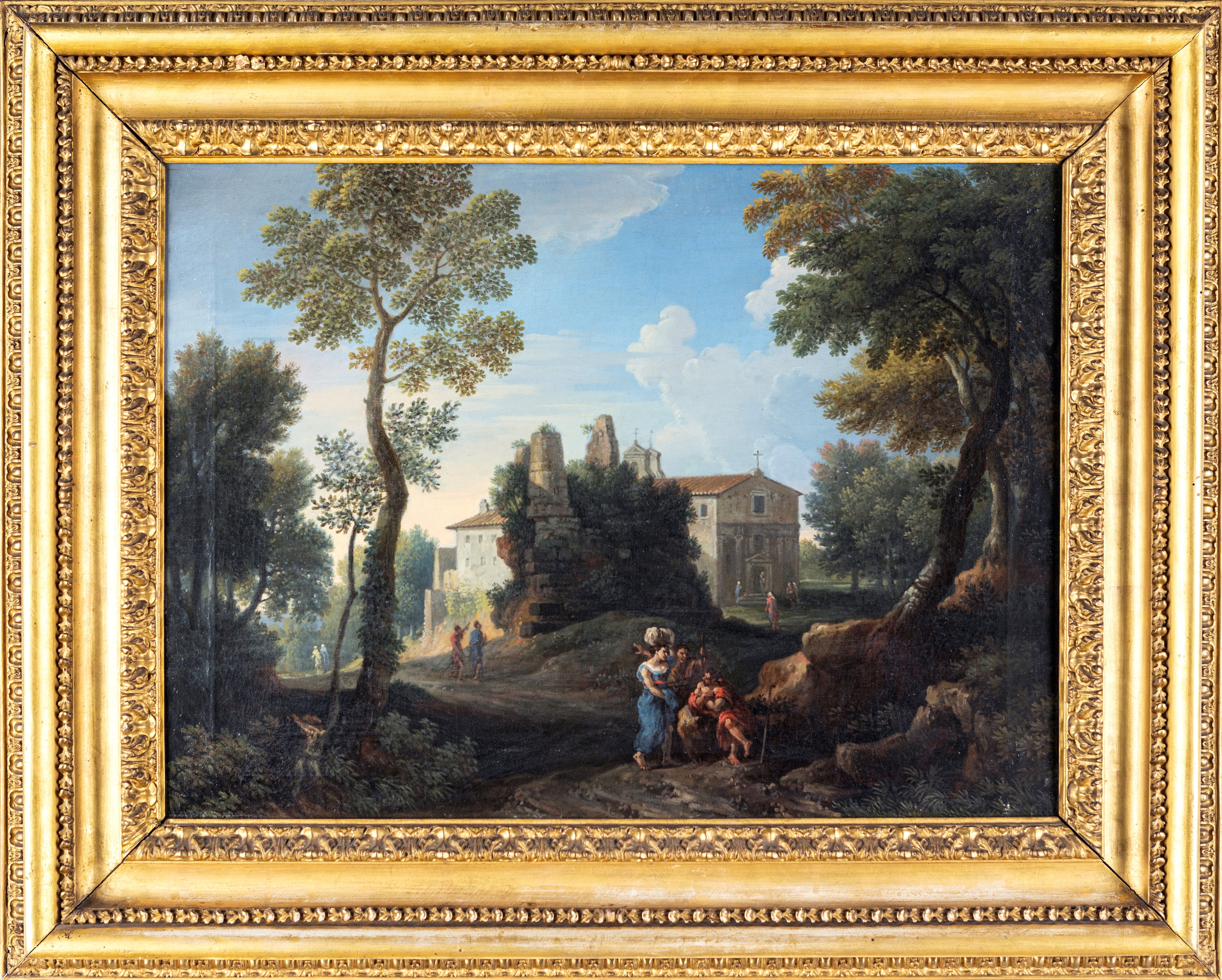 Una chiesetta emerge solitaria al lato di un sentiero di campagna tra le fronde rigogliose di una radura. Popolano la scena una serie di pastori abbigliati all'antica, con delle tuniche colorate. Il cielo terso, con un accenno di tramonto che sembra giungere dalla sinistra delle tela con le sue tonalità rosee e aranciate, indica che l'autore non può trattarsi che Jan Frans van Bloemen, detto l'Orizzone, proprio per la grande abilità nel rendere i cieli romani.