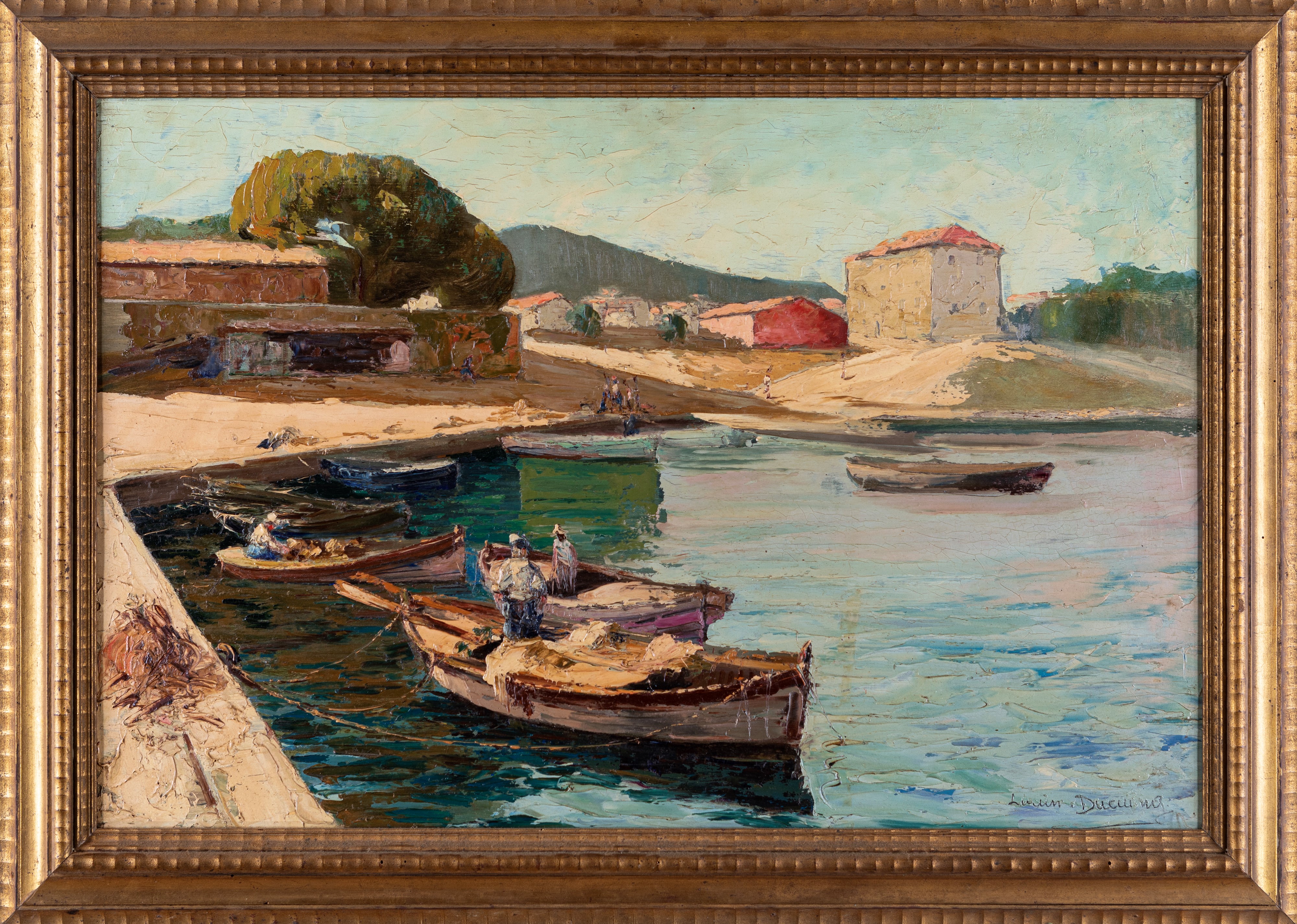 Firmato in basso a destra "Lucien Ducuing"; al verso veduta del porto di Livorno