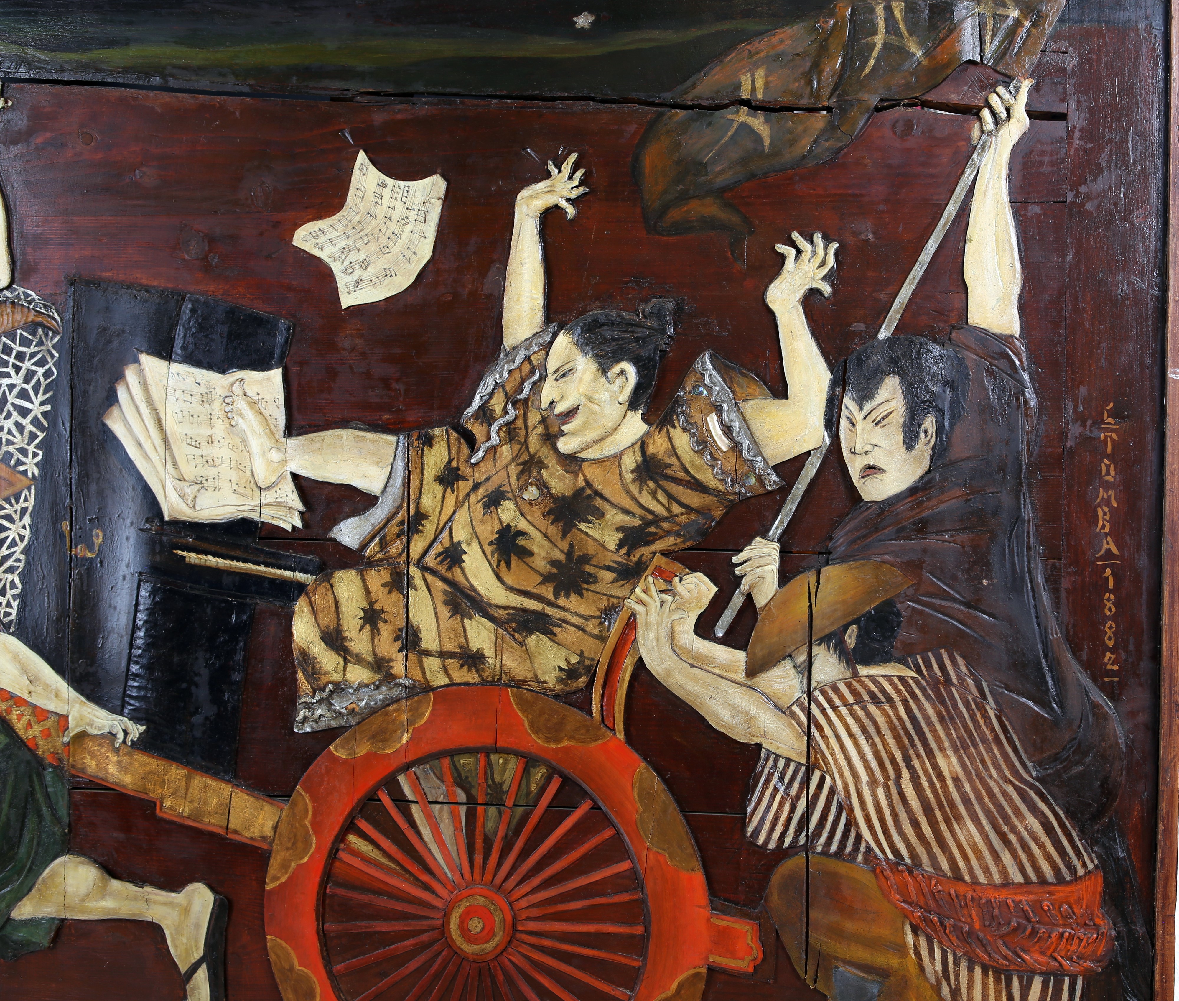 Come testimoniato dalle memorie di Casimiro Tomba si tratta di un rarissimo elemento decorativo delle sale del Circolo artistico aperto nel 1887 dagli artisti romani dell'Associazione artistica internazionale in via Margutta 54 e solennemente inaugurato alla presenza dei reali. La decorazione delle sale era stata eseguita dagli stessi soci del Circolo (Guido Boggiani, Enrico Coleman, Filiberto Petiti). Per la saletta giapponese Casimiro Tomba realizza in collaborazione con Gioacchino Pagliei due bassorilievi, uno raffigurante la Morte del re Sifone e l'altro, presentato in questa sede, in maniera ironica Il trasloco del Circolo artistico dalla vecchia sede di Alibert, durante cui gli artisti avevano percorso i pochi metri accompagnati dalla musica di un pianoforte posto su un carretto e suonato dal pittore Edoardo Navone.