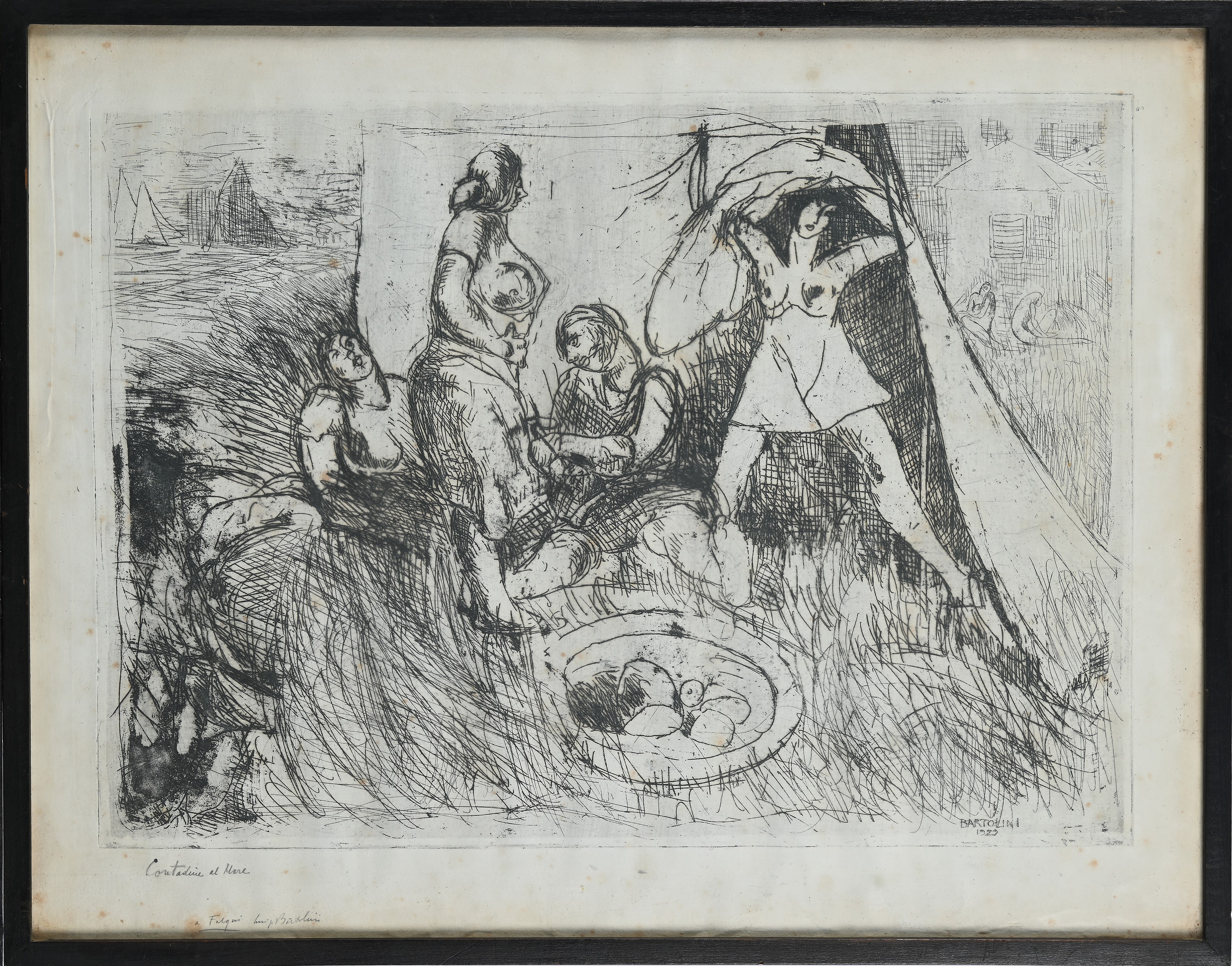 Firma, dedica e titolo "Contadine al mare. A Falqui, Luigi Bartolini". Firma e data incise "Bartolini 1922"
