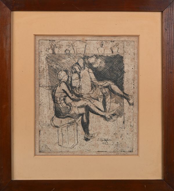 Titolo in basso a destra "Sosta di modelle". Firma e data in lastra "L. Bartolini 1933".