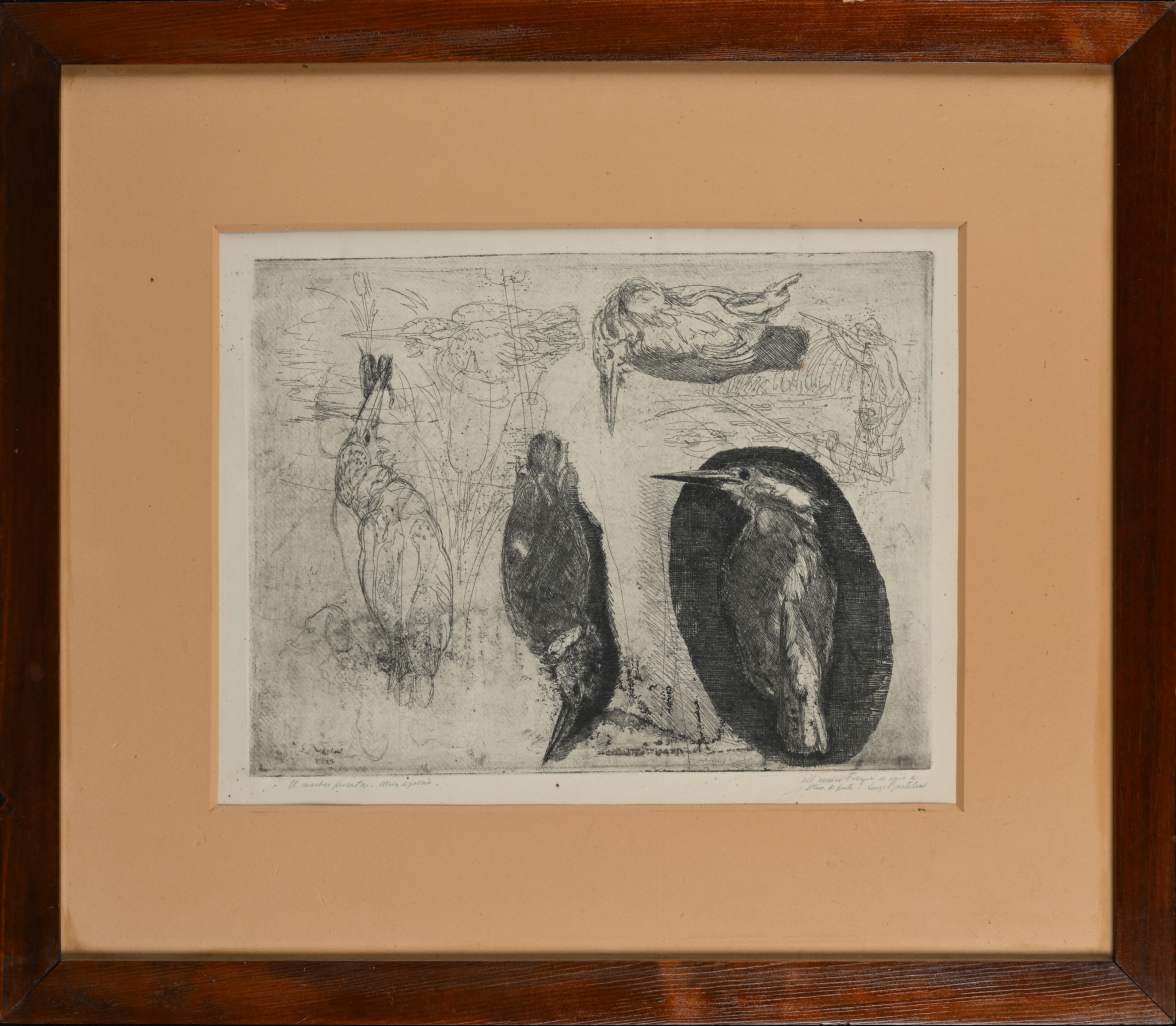 Firma titolo e dedica a matita "Il martin pescatore. Storia di poesia. All'Amico Falqui in segno di stima di poeta. Luigi Bartolini". Firma e data incise in lastra "L. Bartolini 1935"