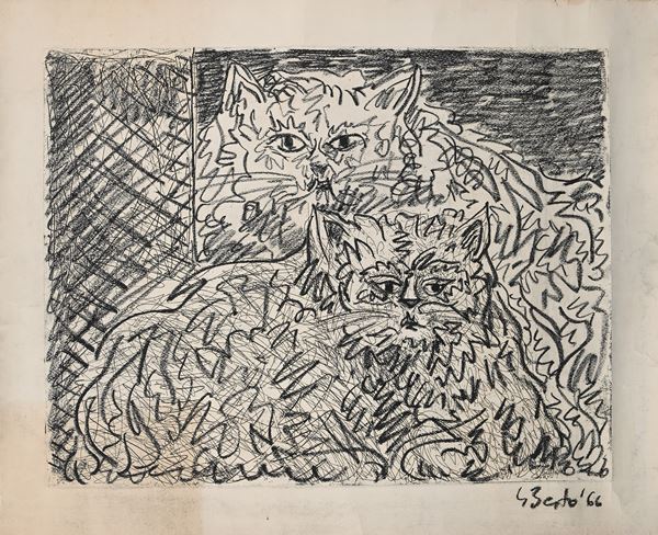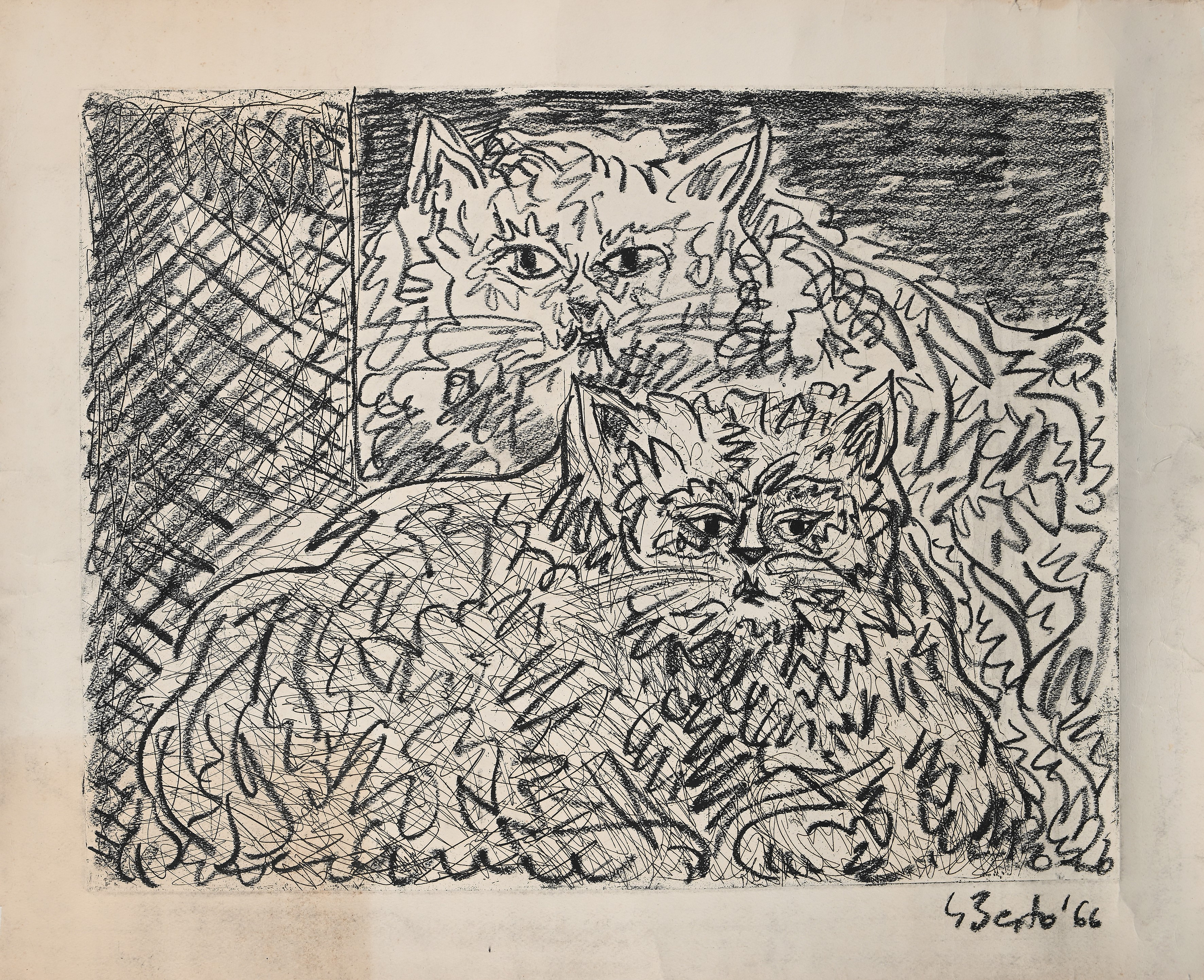 1) Gatto, 1966, acquaforte con intervento a carboncino, cm 76x61. Firma e data "Berto '66